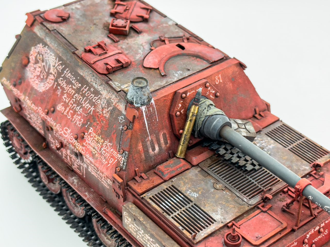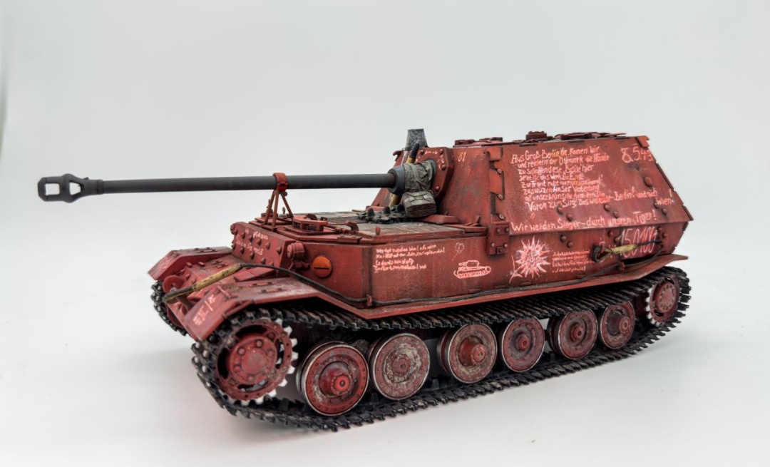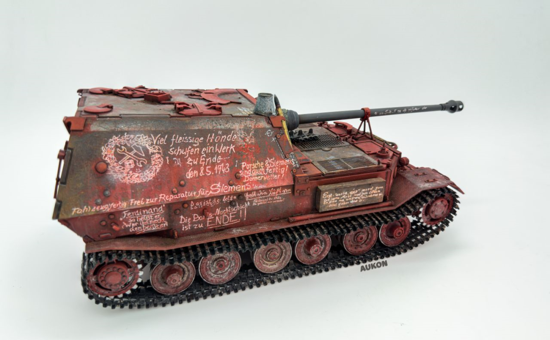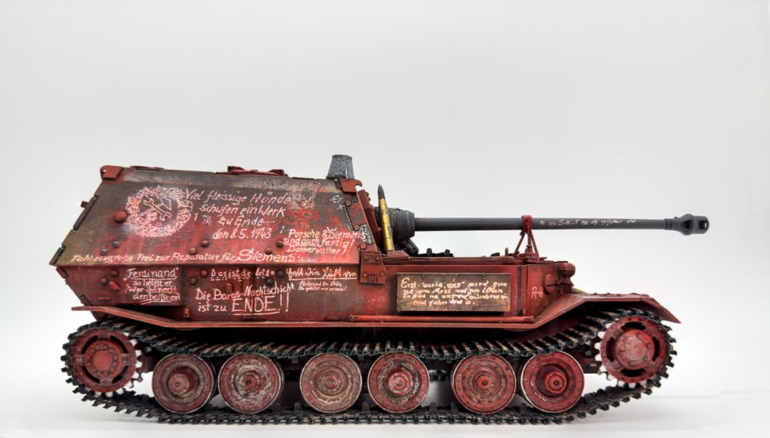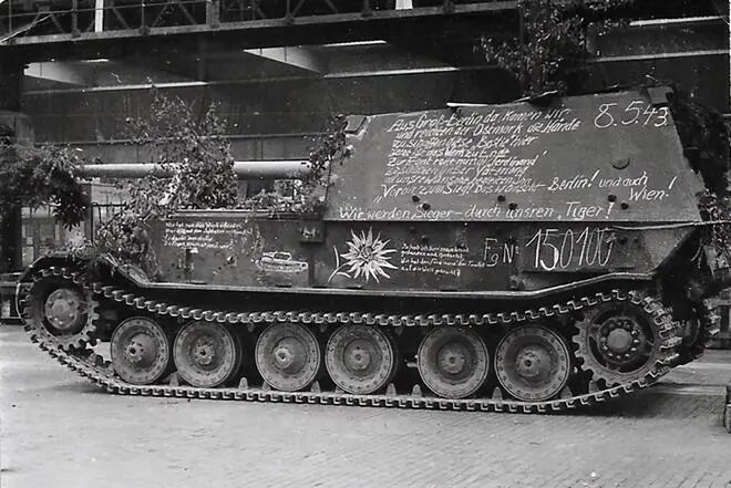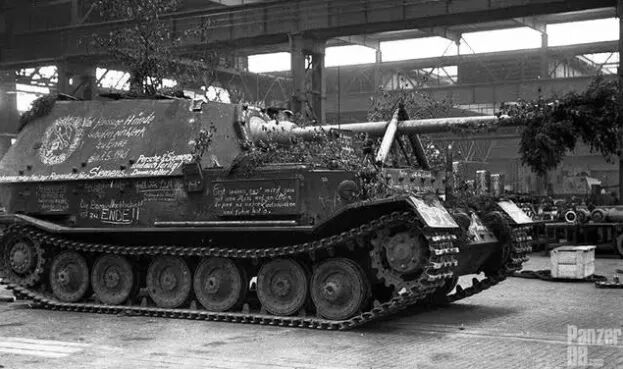 最后一台完工的“斐迪南”坦克歼击车,注意其侧面的编号150100,车间工人为这辆车写上了大量祝福语。