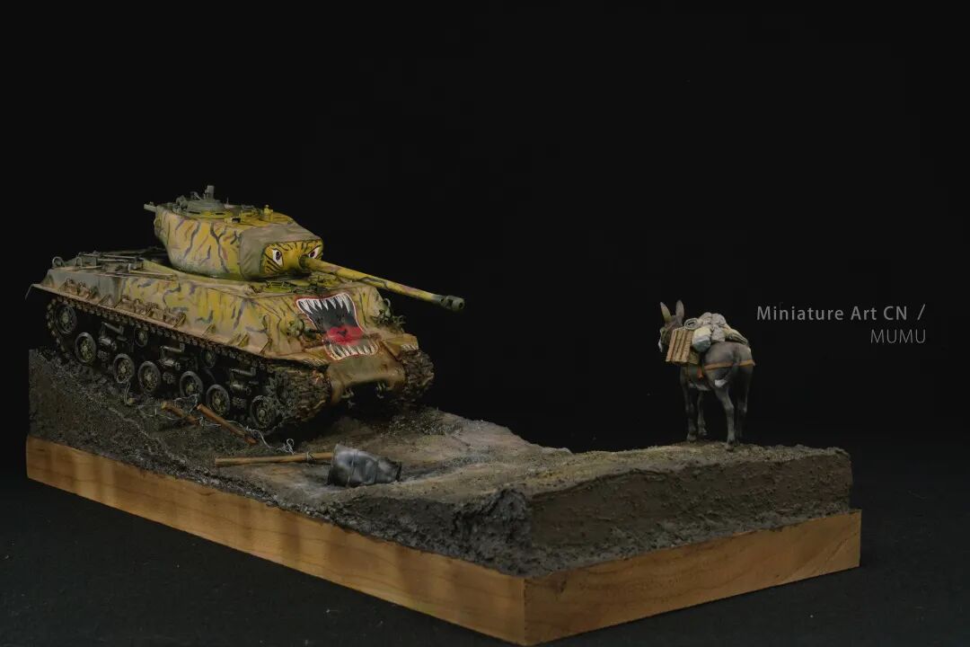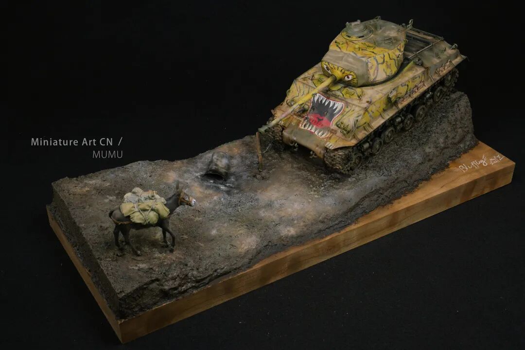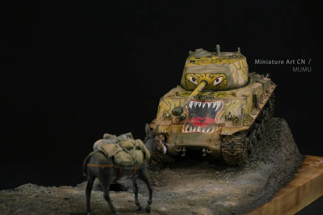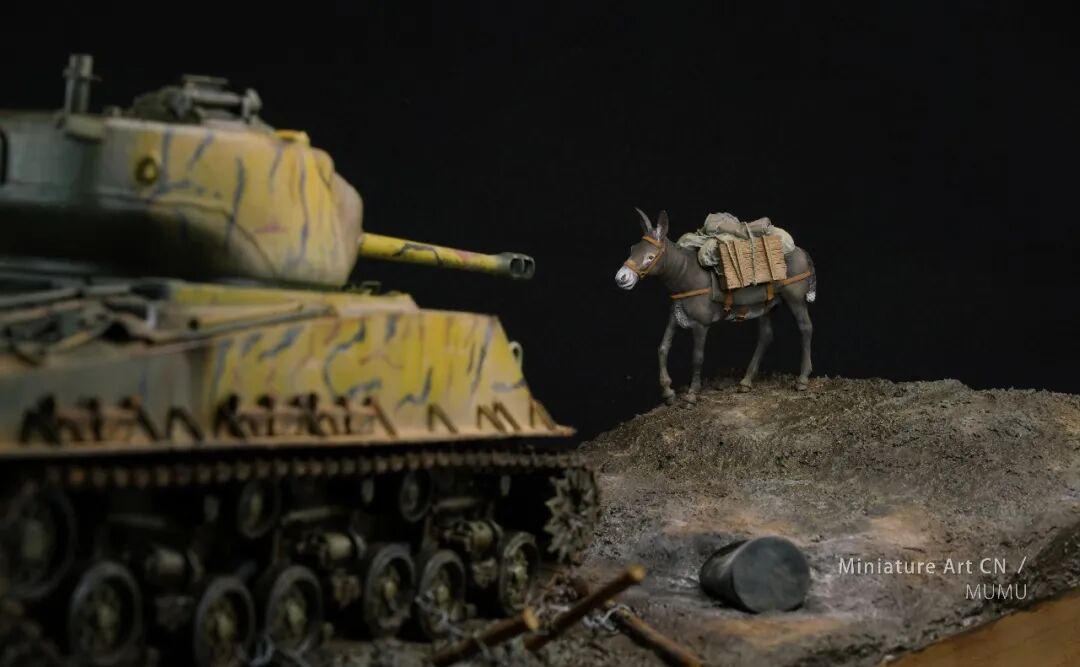 朋友们!我就问!今天的小景带劲不带劲!板件是麦田的馒头,作者精湛的制作和巧妙的设计(这里面不管制作还是场景搭配都是有很多学问的,小编也描述不清楚,大家自己感受吧)赋予了这件作品非常浓郁的感情色彩,侵略者的坦克,战场上威风凛凛,虎面涂装看似霸气威武,实际上也只是一个虚张声势的纸老虎罢了!战区一只走散的小驴子都瞧不上它~