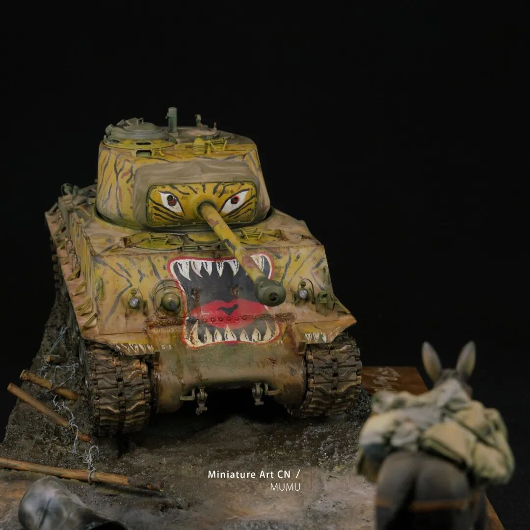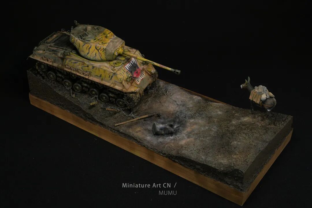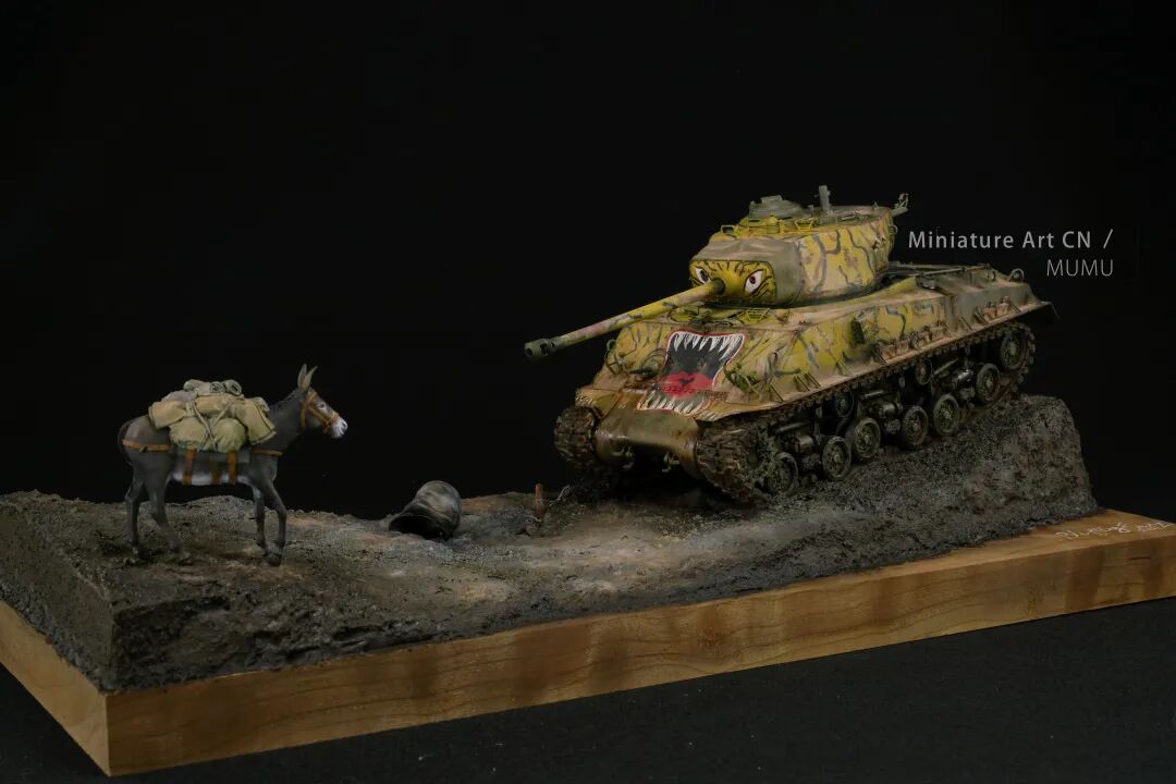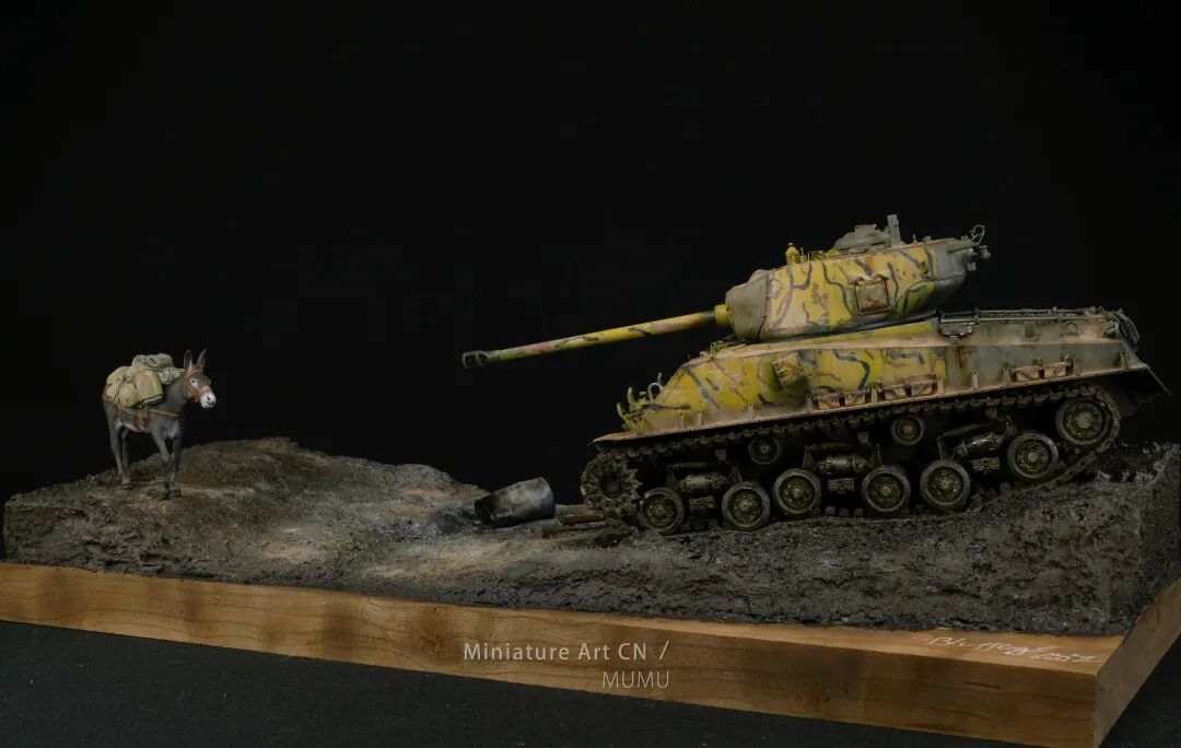 朋友们!我就问!今天的小景带劲不带劲!板件是麦田的馒头,作者精湛的制作和巧妙的设计(这里面不管制作还是场景搭配都是有很多学问的,小编也描述不清楚,大家自己感受吧)赋予了这件作品非常浓郁的感情色彩,侵略者的坦克,战场上威风凛凛,虎面涂装看似霸气威武,实际上也只是一个虚张声势的纸老虎罢了!战区一只走散的小驴子都瞧不上它~