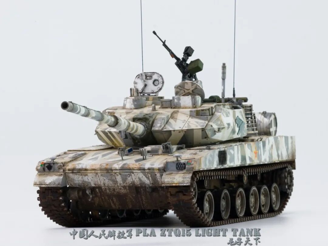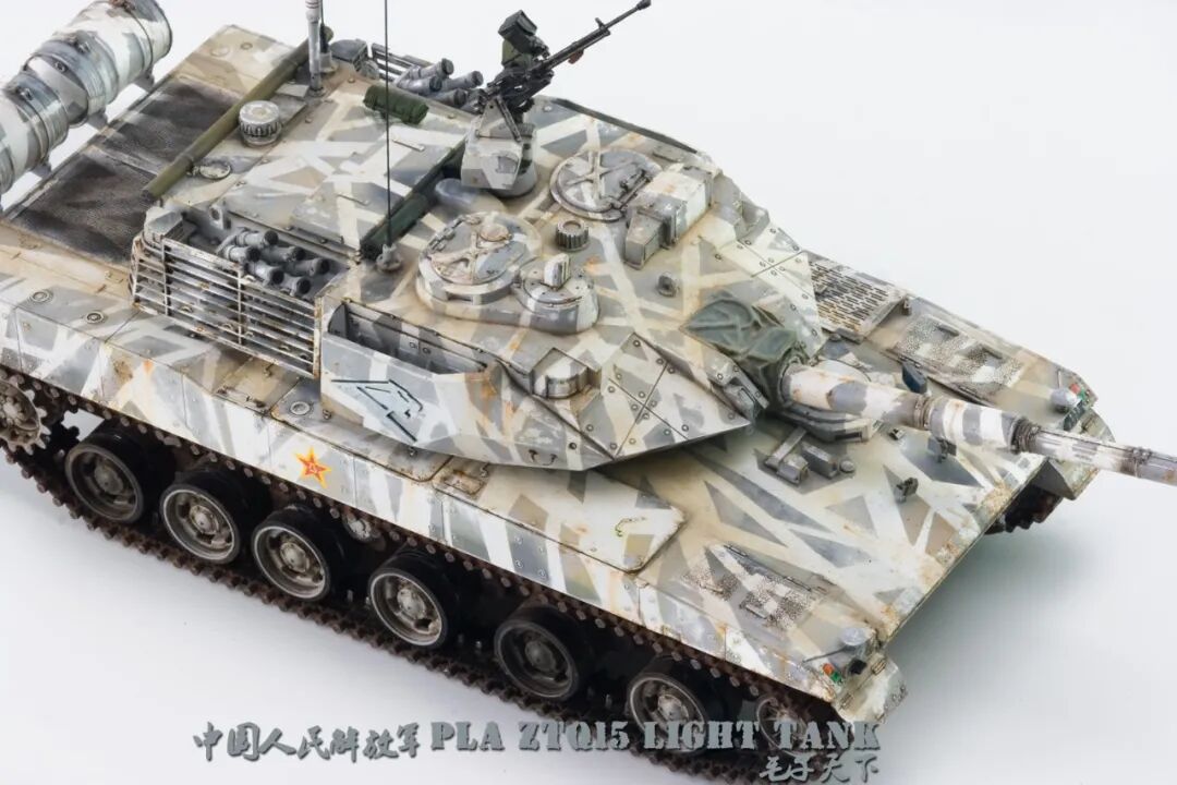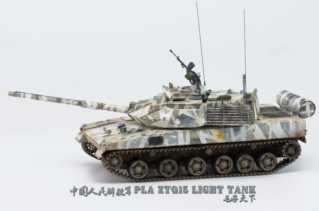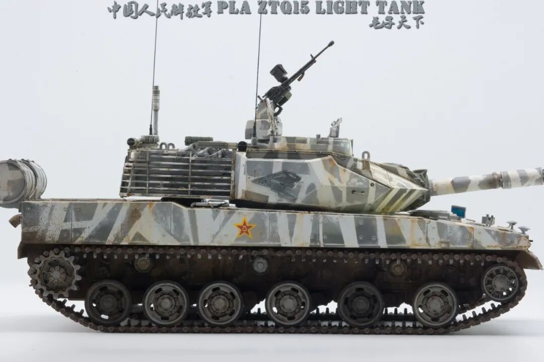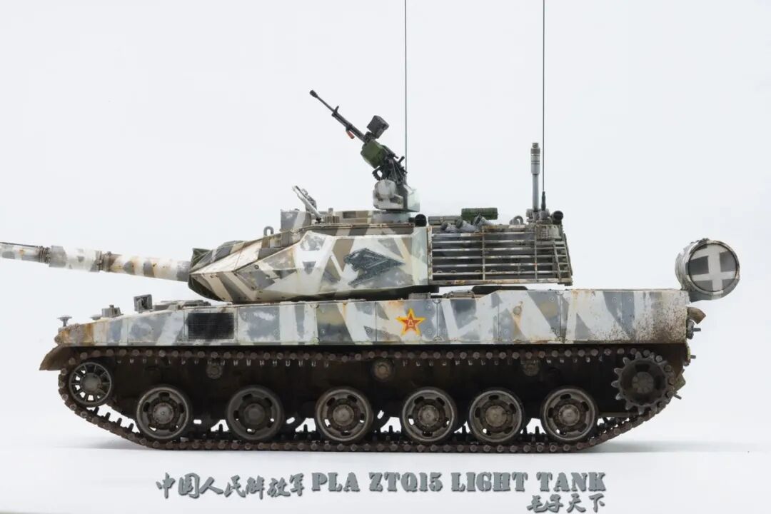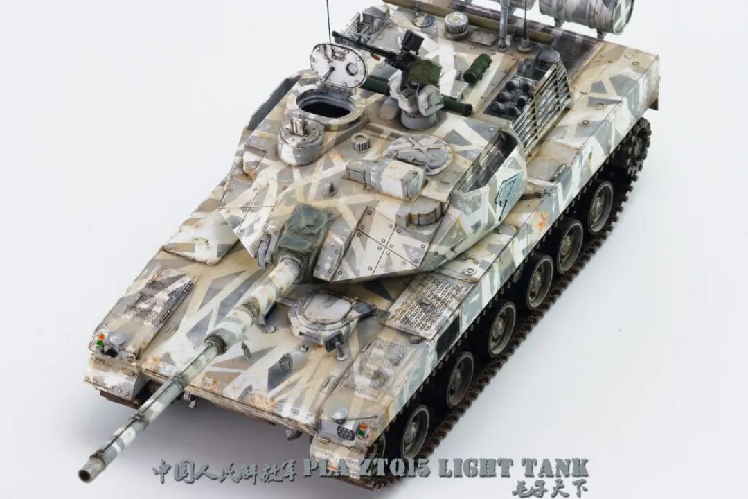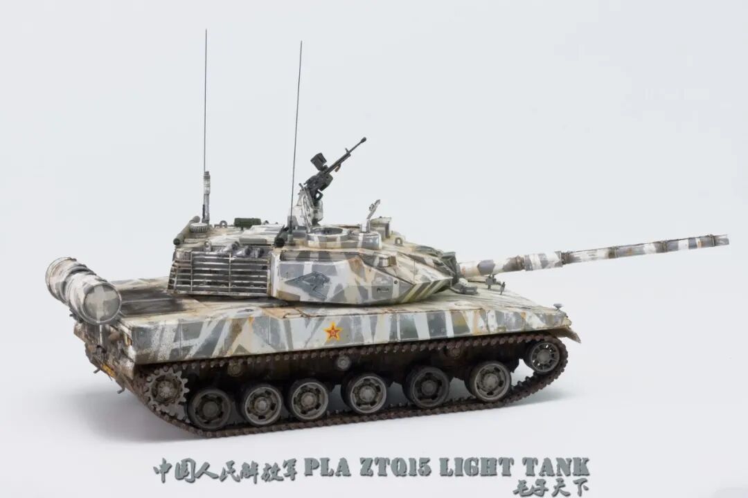 15式轻型坦克的正式编号为:ZTQ-15,是新一代中国轻型坦克,是一个专门为山区作业设计的新型轻型坦克。新坦克被指定用于西藏自治区等高海拔崎岖地形,因此它具有重量轻和强大的柴油发动机,适用于缺氧环境,同时,15式还配备了一个加装30mm榴弹发射器和机枪的武器平台,可以放置手持式反坦克武器,并且配备了1000马力的发动机,可以提供强大的越野机动性,其配备的现代化的火控系统,可以在夜间和恶劣的环境下捕捉并瞄准目标,整体作战能力跻身当今世界顶尖水平。