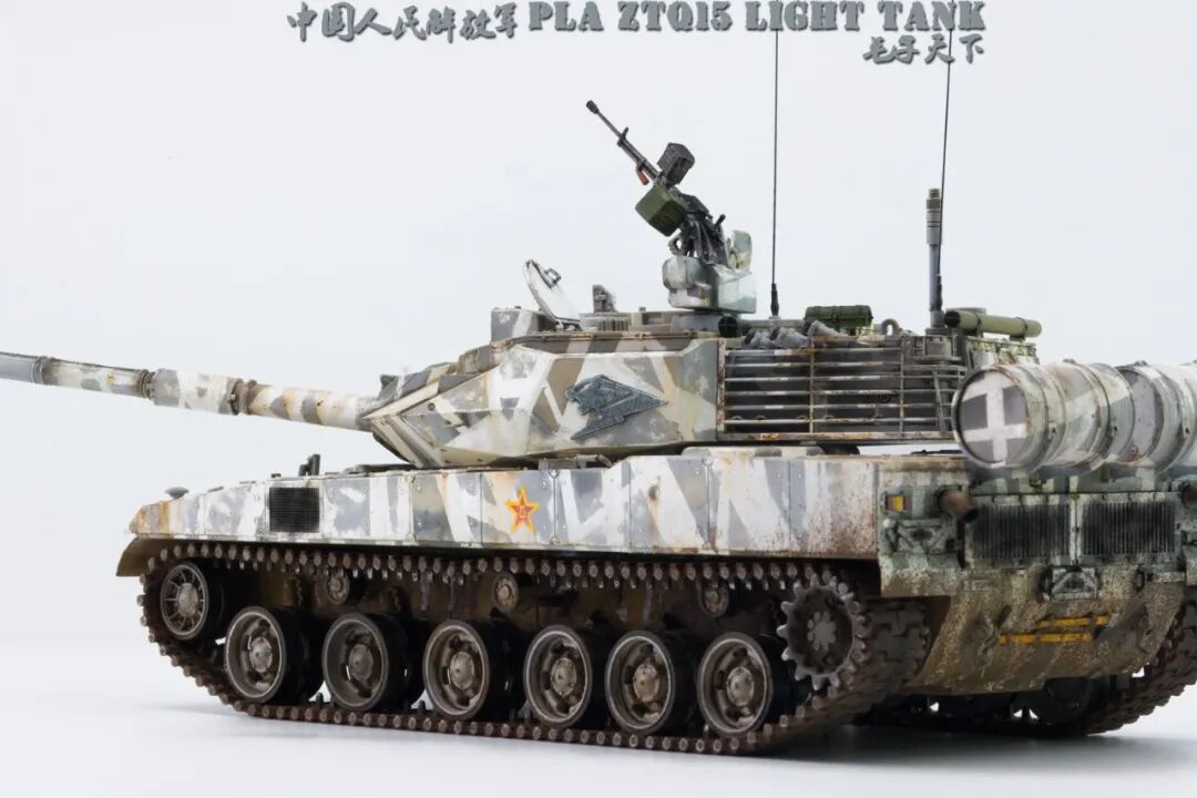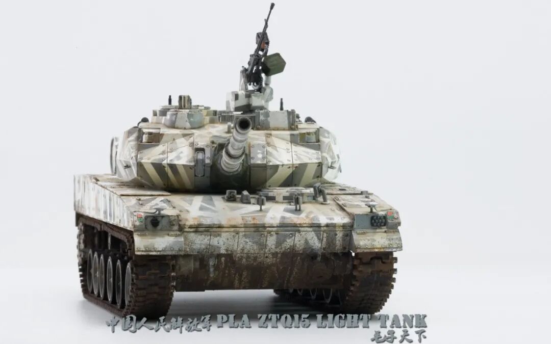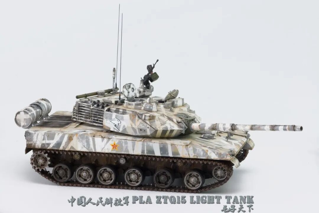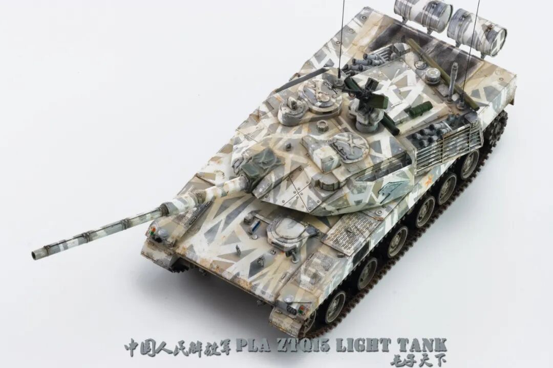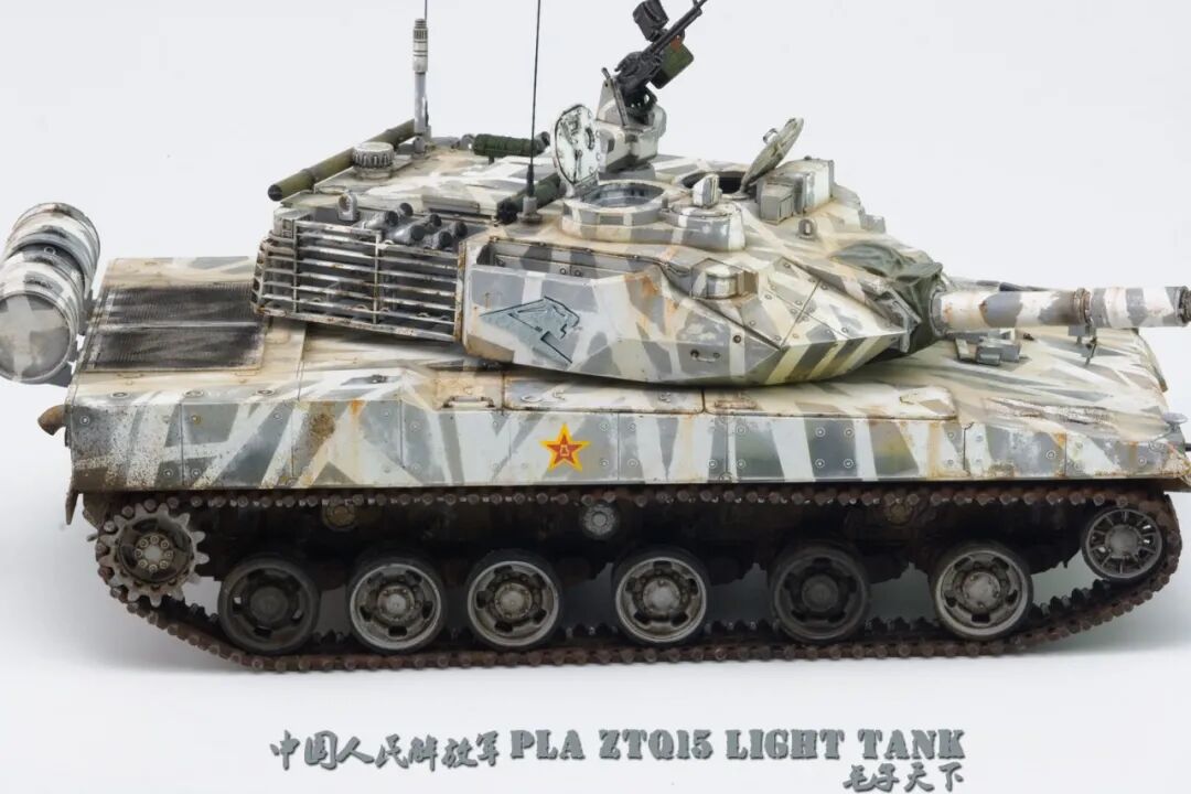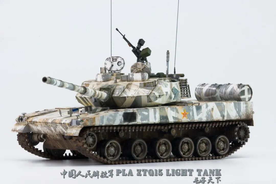 15式轻型坦克的正式编号为:ZTQ-15,是新一代中国轻型坦克,是一个专门为山区作业设计的新型轻型坦克。新坦克被指定用于西藏自治区等高海拔崎岖地形,因此它具有重量轻和强大的柴油发动机,适用于缺氧环境,同时,15式还配备了一个加装30mm榴弹发射器和机枪的武器平台,可以放置手持式反坦克武器,并且配备了1000马力的发动机,可以提供强大的越野机动性,其配备的现代化的火控系统,可以在夜间和恶劣的环境下捕捉并瞄准目标,整体作战能力跻身当今世界顶尖水平。
