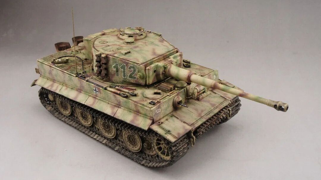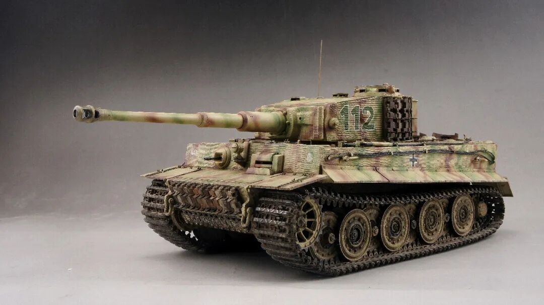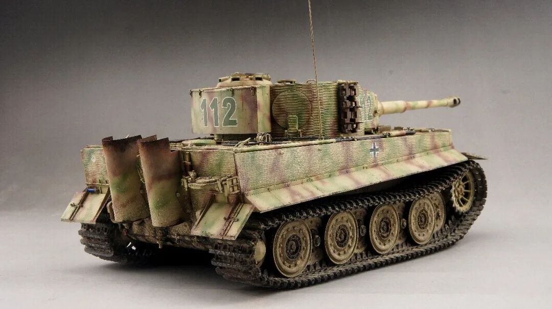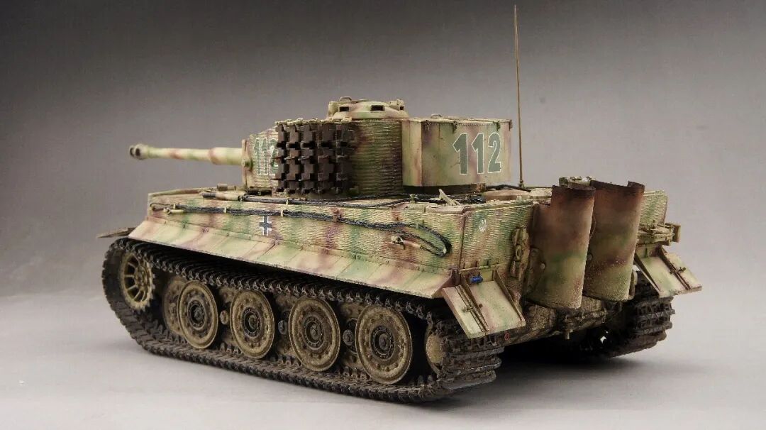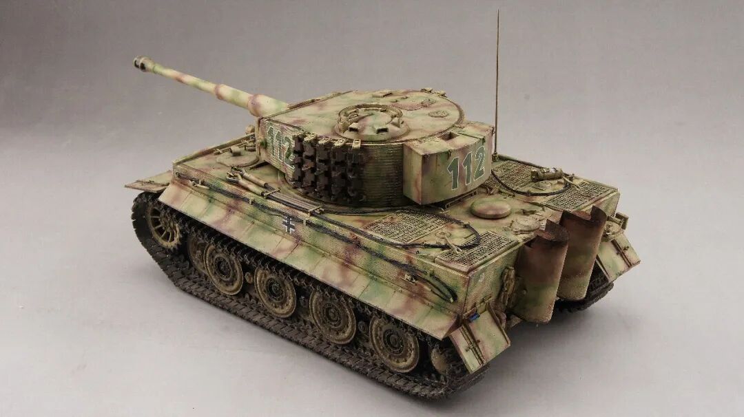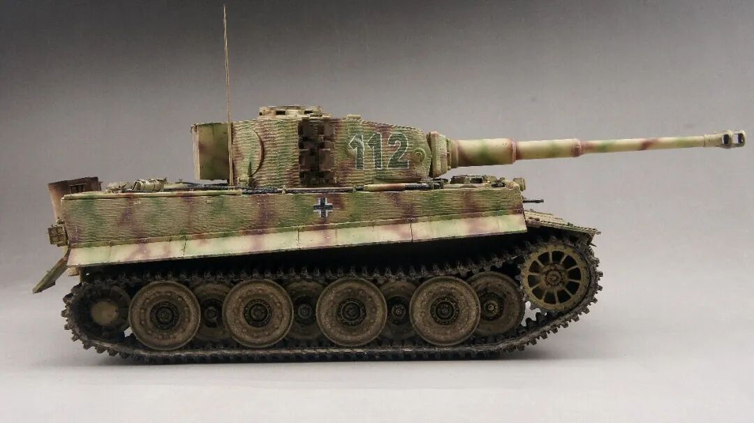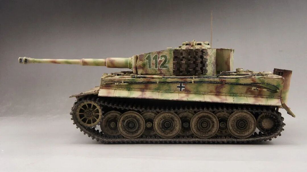 本作的虎式后期型坦克,是在诺曼底地区作战的,党卫军第一装甲师112号,炮塔的防磁装甲是粗纹路,车体的防磁装甲是细纹路的。所以用威龙的6800路轮和车体加6700防磁炮塔,防磁拼成一台车。