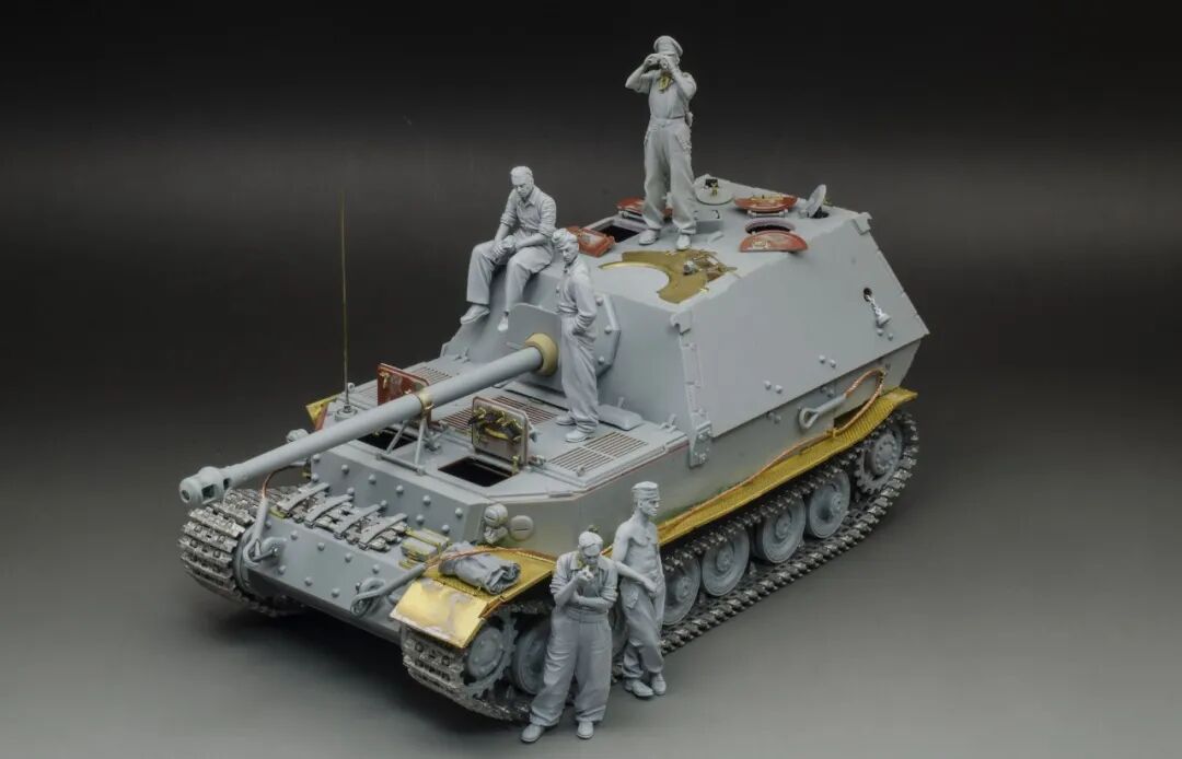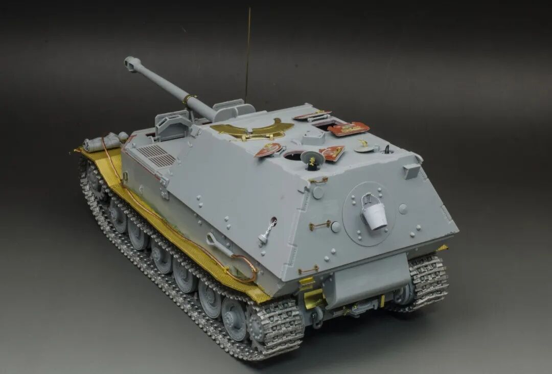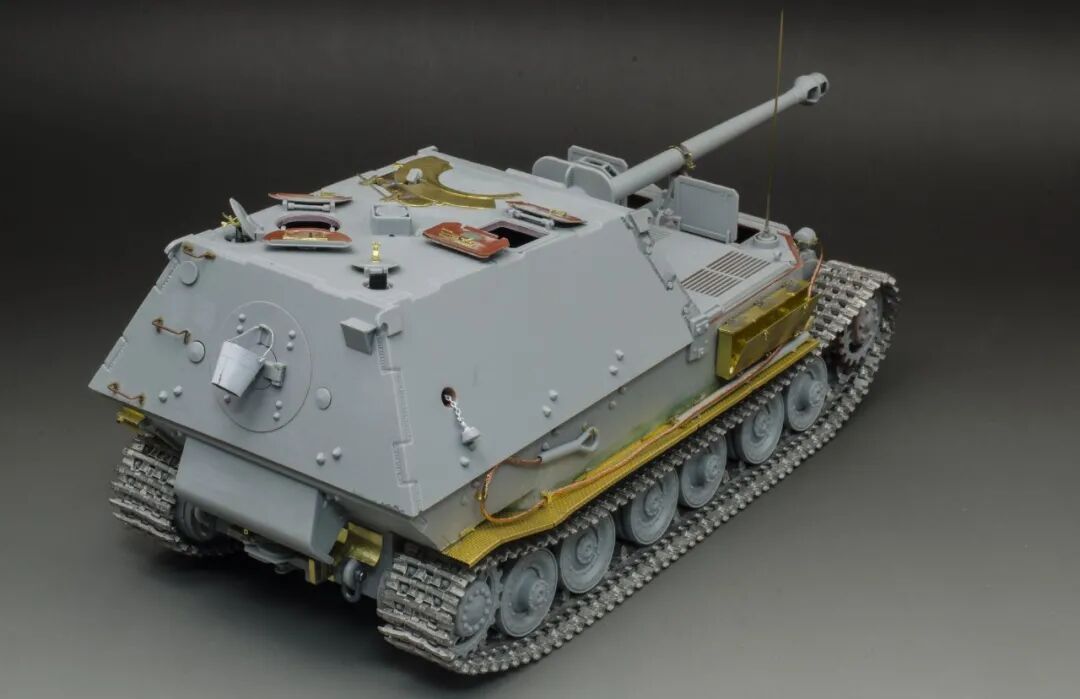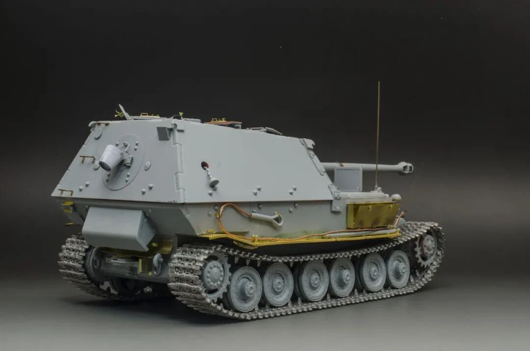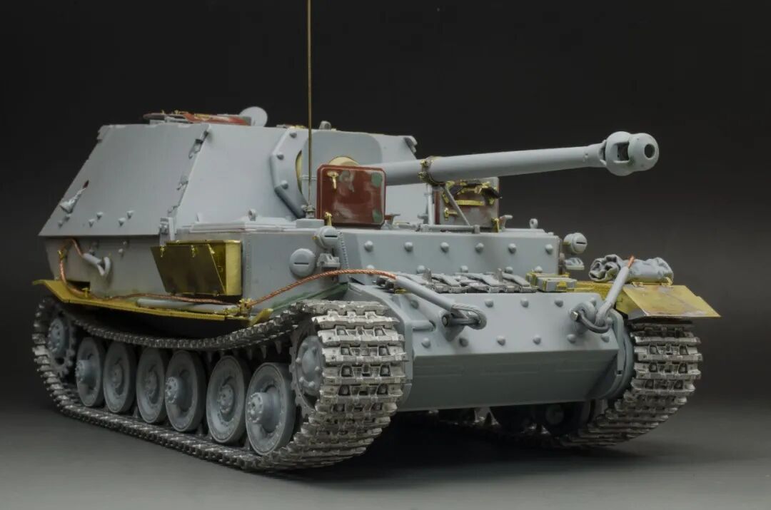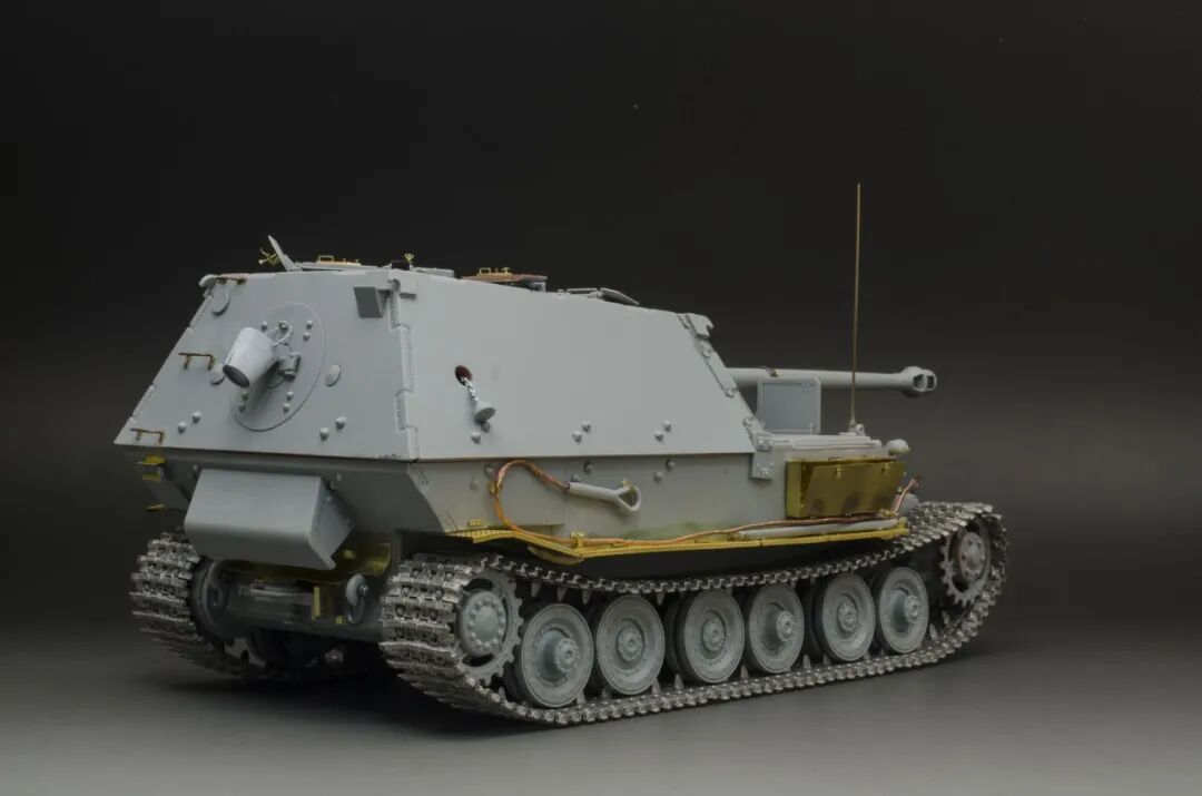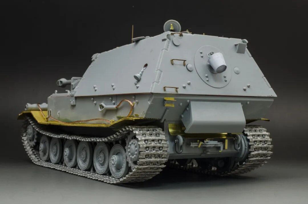 素组阶段没有太多困难的地方,翼子板下方的支撑记得追加就好,其次要注意改了活动悬挂之后要增加限位,不然悬挂会过低,其次是炮塔顶部的观瞄装置盖板PE制作时,要多多参考实车位置,多做假组方可避免粘错位置。再就是炮管能换就换吧。别的没啥困难的地方了,这车子零件不多,而且组合度不错。