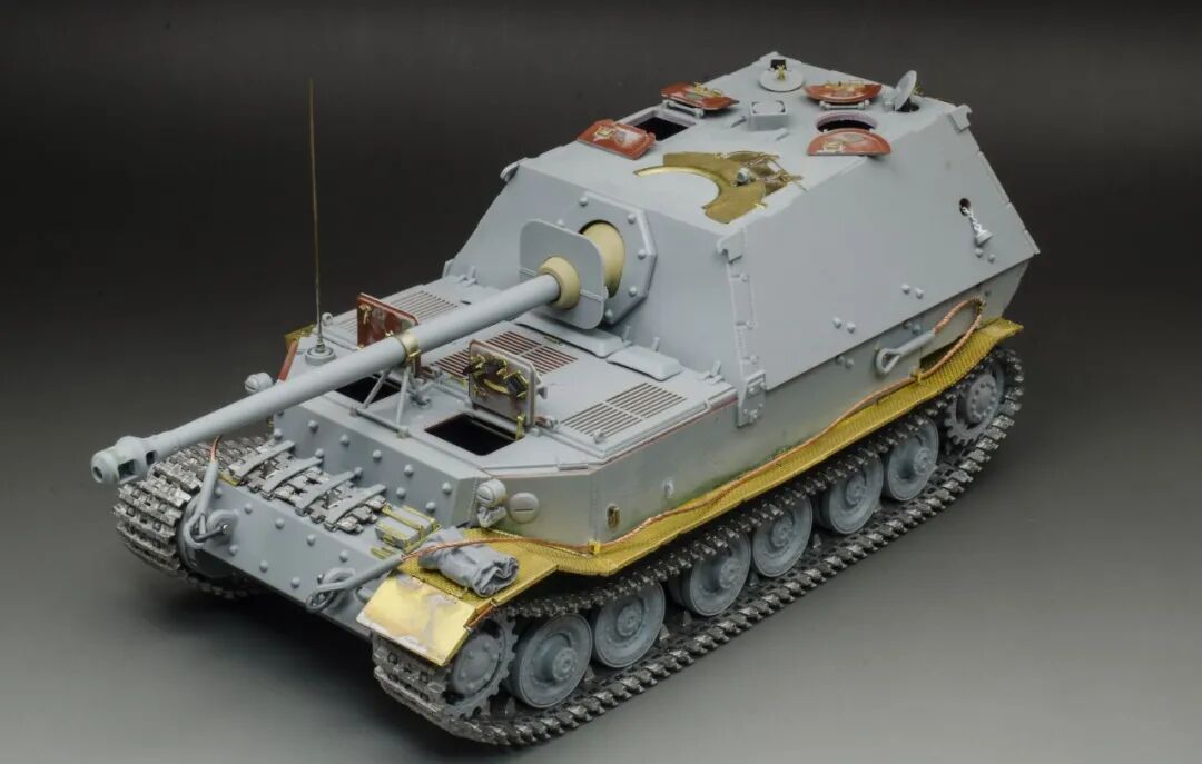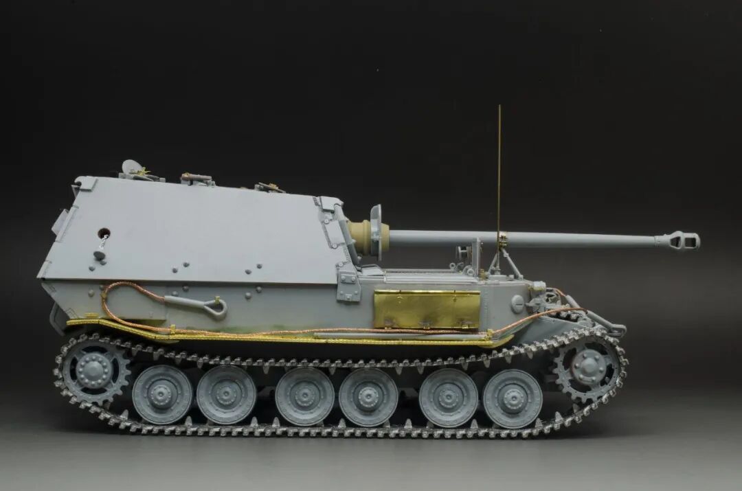 这算是我第一次做威龙的费迪南,可能是板件有些年代久远了,感觉有点不爽:首先原版塑料炮管过细,金属的尺寸又不对,外形也有点离谱,只能弃之不用,最后还是再版后的整根塑料炮管形状还算凑合。然后就是炮居然左右不能动啊。。。。。也就是说即便是PE改了瞄具的盖板也没法做成联动的效果了。