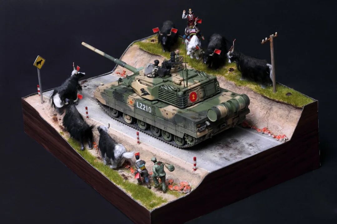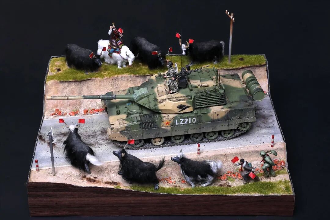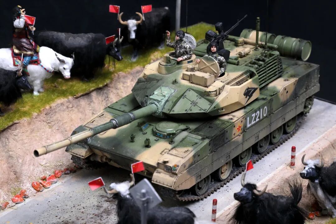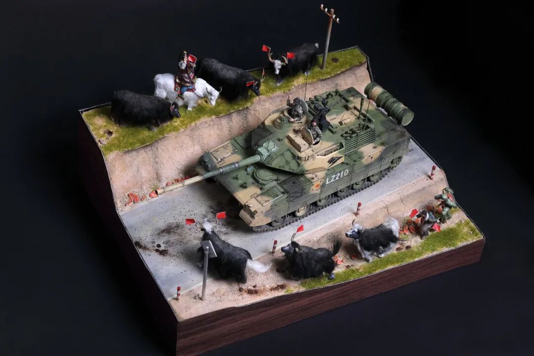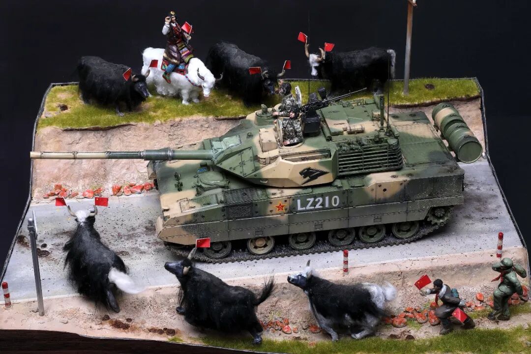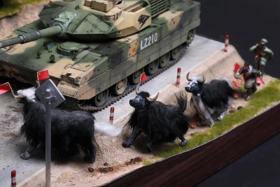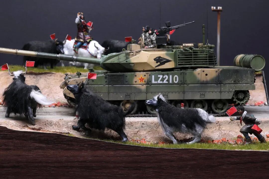模型比例为1/35,坦克及坦克兵使用Meng的套件。牦牛模型及平民为AB补土塑型。模型场景设定为西藏南部地区,这里植被相对茂盛,因此迷彩使用了解放军常用的三色迷彩,这在目前模友们制作的15式里是很少的,大家更偏爱数码,我在制作前也是斗争了许久,好在喷完漆效果还是很好的。场景故事,国庆期间15式黑豹外出驻训,沿途的藏民欢迎解放军的到来,调皮的藏族小学生追着牦牛要往牛角上插红旗,惊得牛群四处奔跑,一幅节日的欢乐气氛。