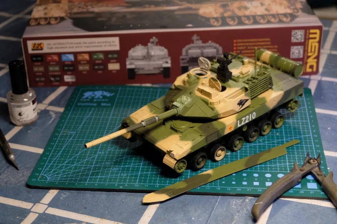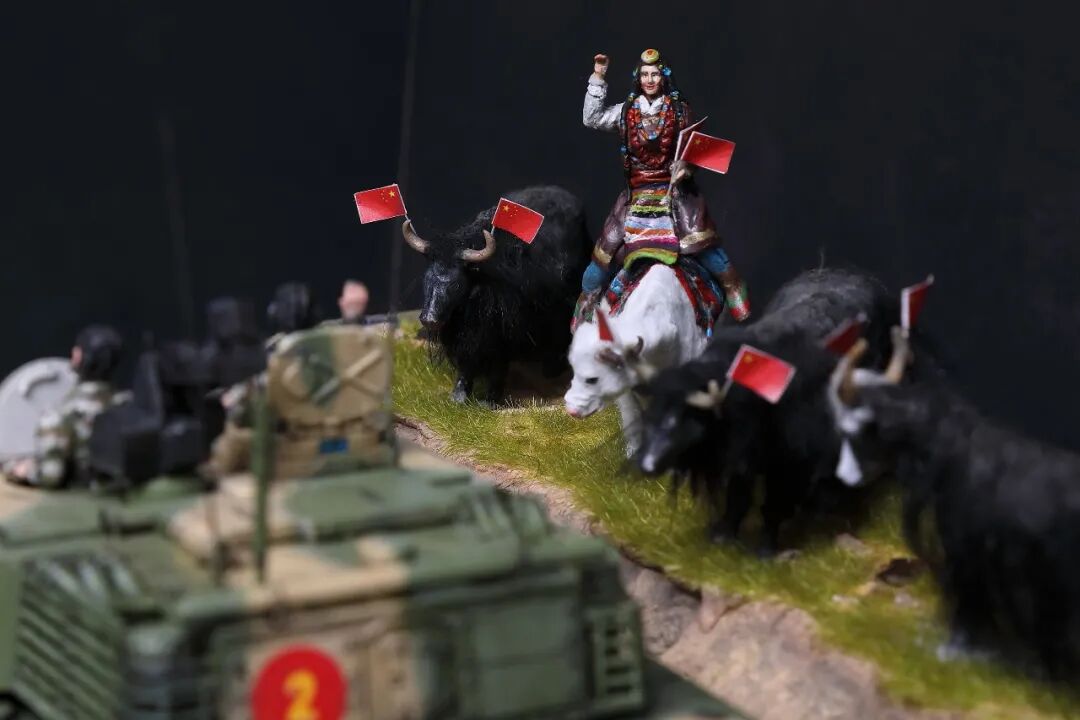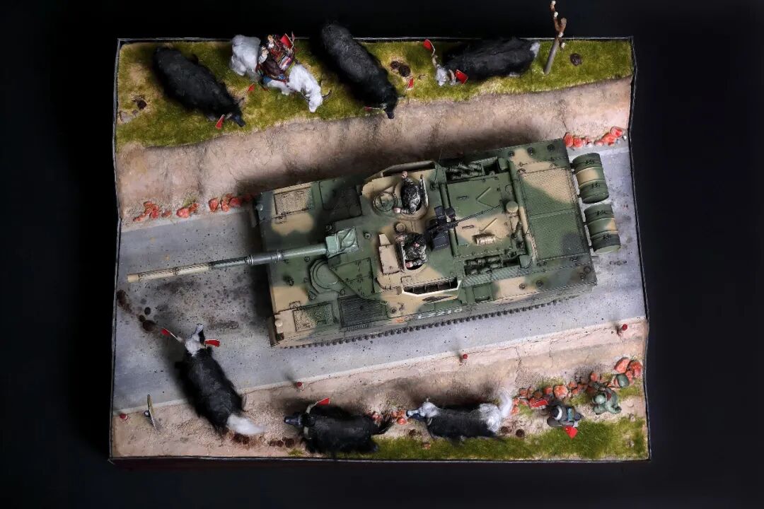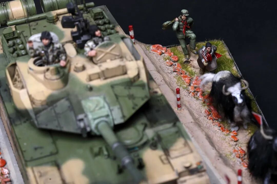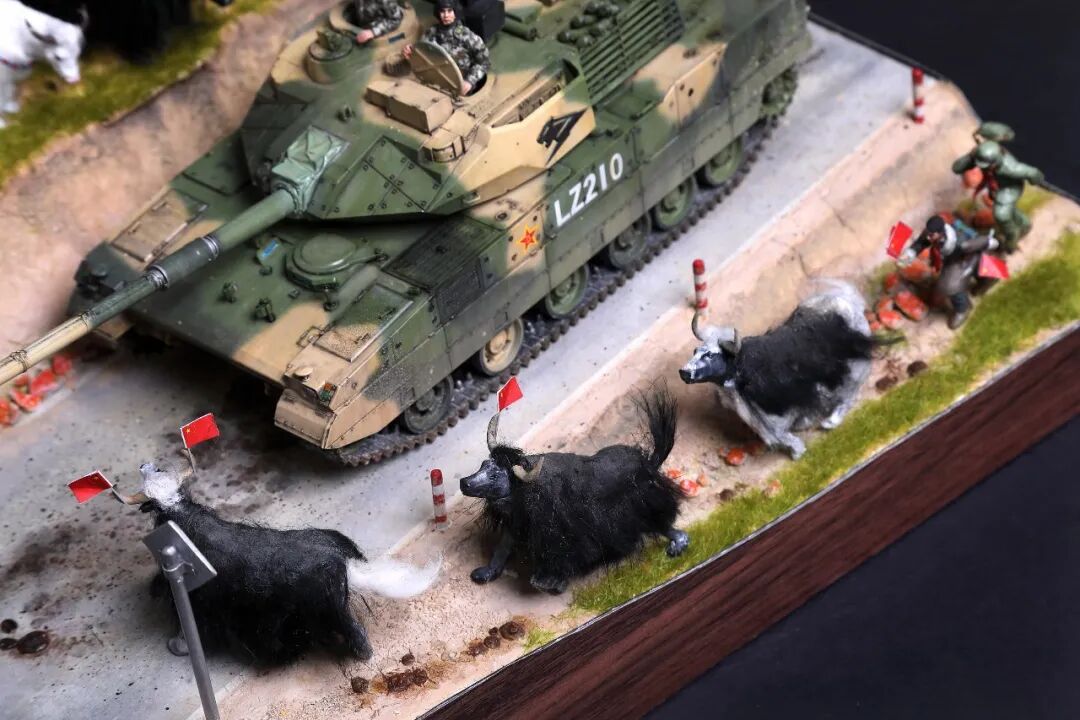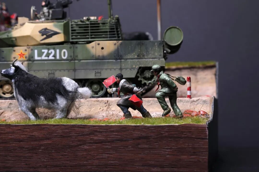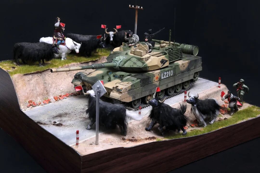 模型比例为1/35,坦克及坦克兵使用Meng的套件。牦牛模型及平民为AB补土塑型。模型场景设定为西藏南部地区,这里植被相对茂盛,因此迷彩使用了解放军常用的三色迷彩,这在目前模友们制作的15式里是很少的,大家更偏爱数码,我在制作前也是斗争了许久,好在喷完漆效果还是很好的。场景故事,国庆期间15式黑豹外出驻训,沿途的藏民欢迎解放军的到来,调皮的藏族小学生追着牦牛要往牛角上插红旗,惊得牛群四处奔跑,一幅节日的欢乐气氛。