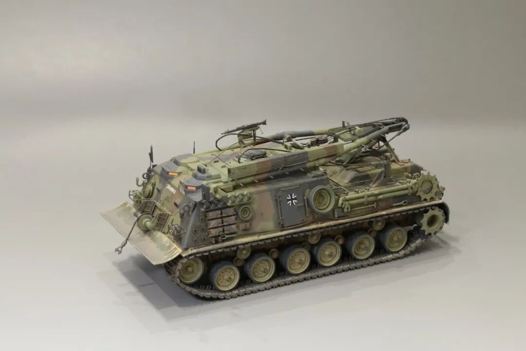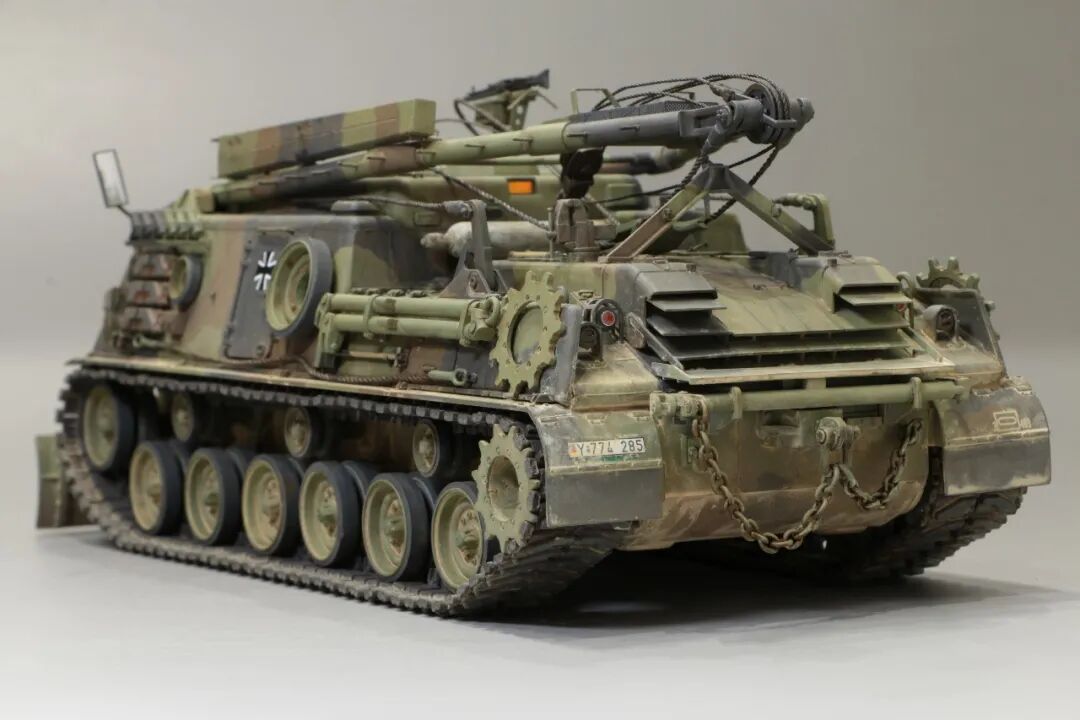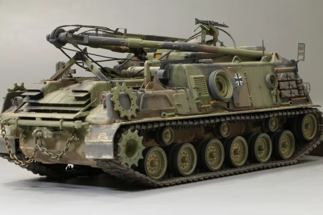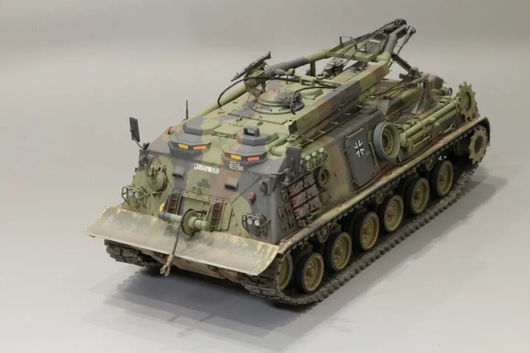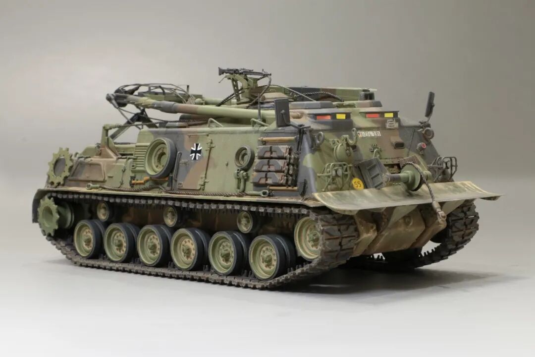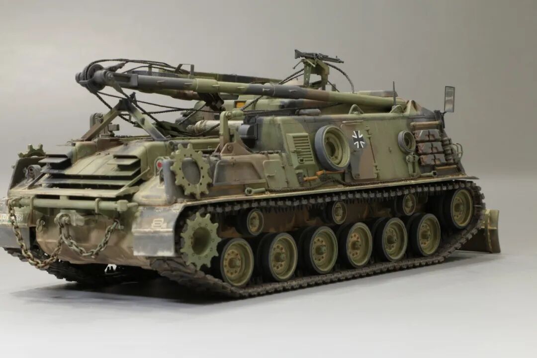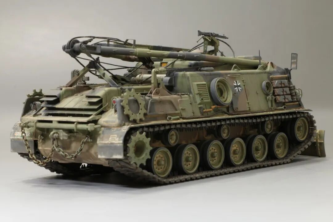 该车采用大陆公司(Continental)AVSI-1790-6A型12缸风冷喷射式汽油机。1972年4月,该公司接受了美国陆军的一项设计M88改进型车辆的合同。1973年,该车改用泰莱达因·大陆汽车(Teledyne Continental Motors)公司的AVDS-1790-2DR 12缸柴油机,功率为551kW(750马力),此外,还匹配了改进的传动装置并进行了其他方面的改进。改造后车辆定名为M88E1,1975年3月又定名为M88A1。从1977年开始该车连续生产,到1989年陆军接受最后一批M88A1时共采购2148辆,另外有878辆M88需要改造,总数为3026辆。今天分享的是德国的M88G1,在美军M88A1基础上加点零件,吊臂也不同,具体的差异小编就不太懂了~