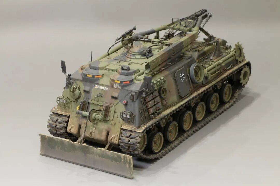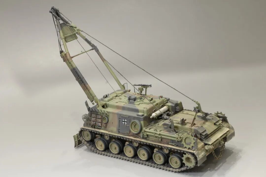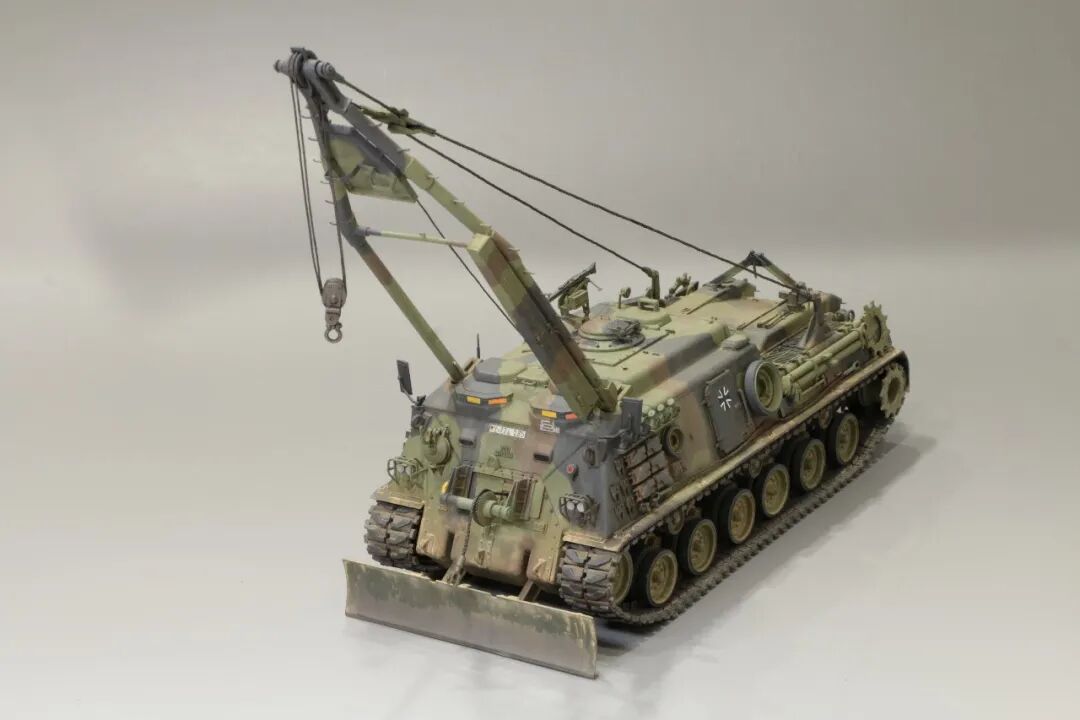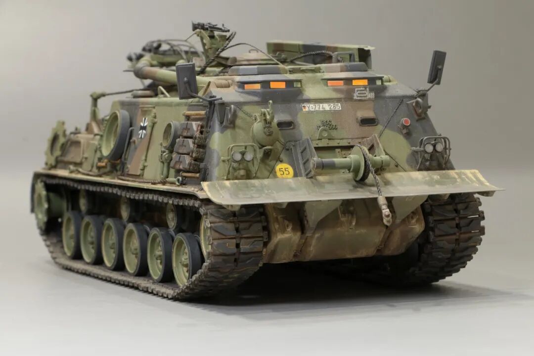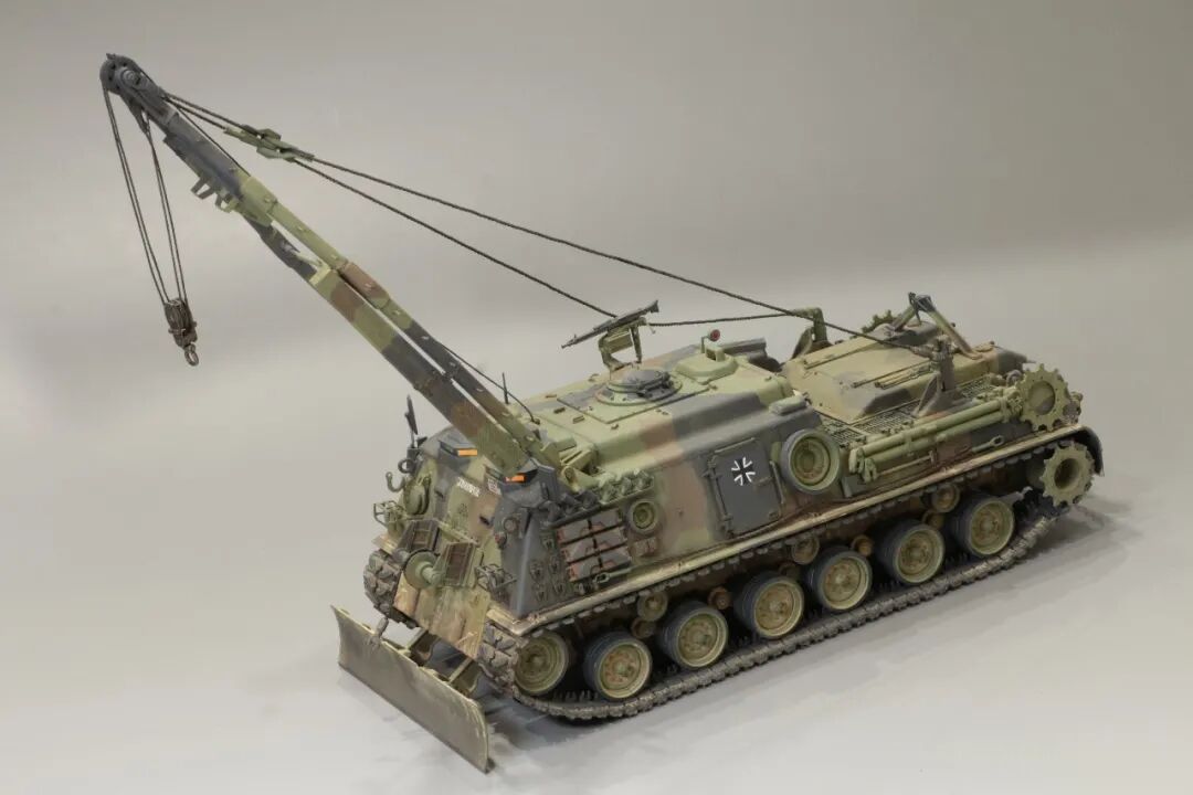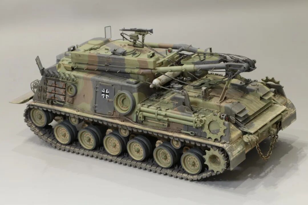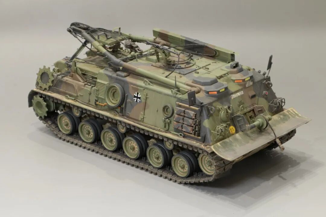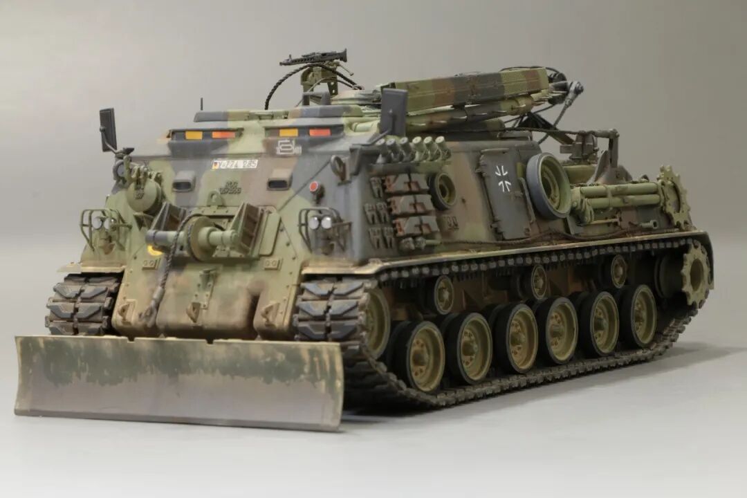 该车采用大陆公司(Continental)AVSI-1790-6A型12缸风冷喷射式汽油机。1972年4月,该公司接受了美国陆军的一项设计M88改进型车辆的合同。1973年,该车改用泰莱达因·大陆汽车(Teledyne Continental Motors)公司的AVDS-1790-2DR 12缸柴油机,功率为551kW(750马力),此外,还匹配了改进的传动装置并进行了其他方面的改进。改造后车辆定名为M88E1,1975年3月又定名为M88A1。从1977年开始该车连续生产,到1989年陆军接受最后一批M88A1时共采购2148辆,另外有878辆M88需要改造,总数为3026辆。今天分享的是德国的M88G1,在美军M88A1基础上加点零件,吊臂也不同,具体的差异小编就不太懂了~