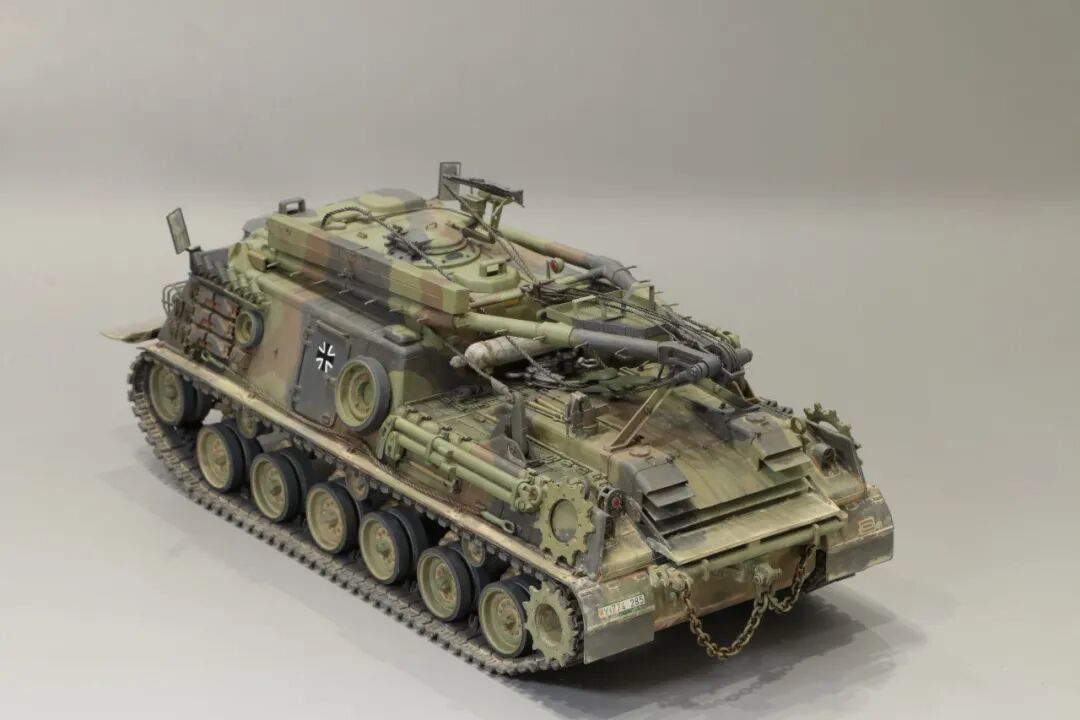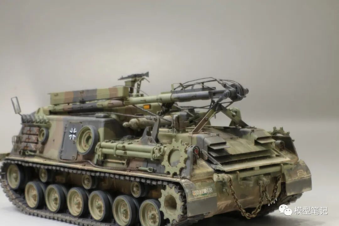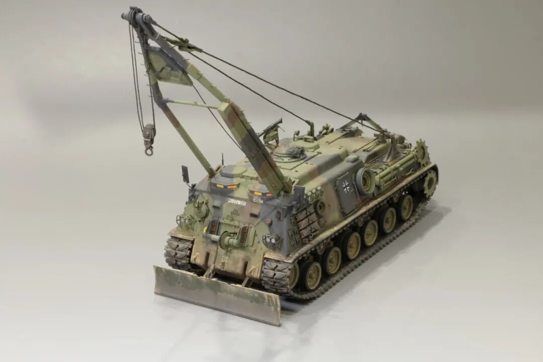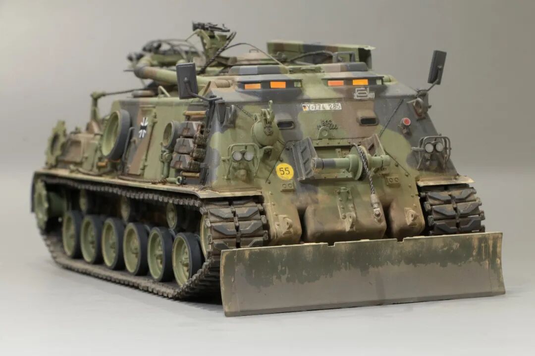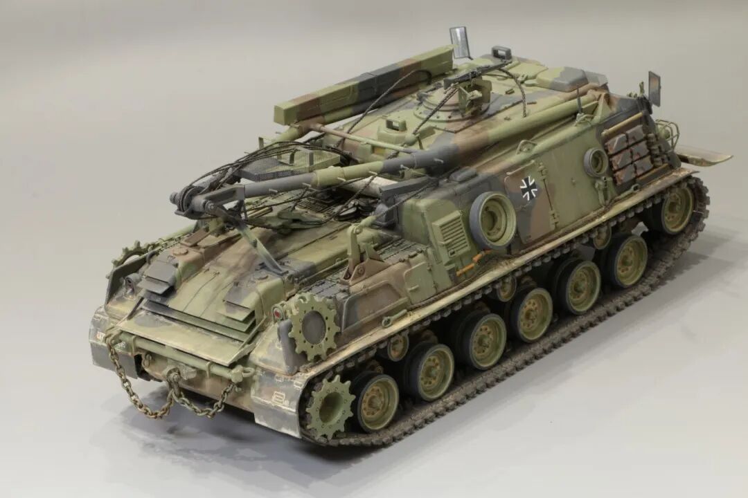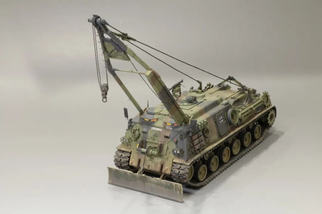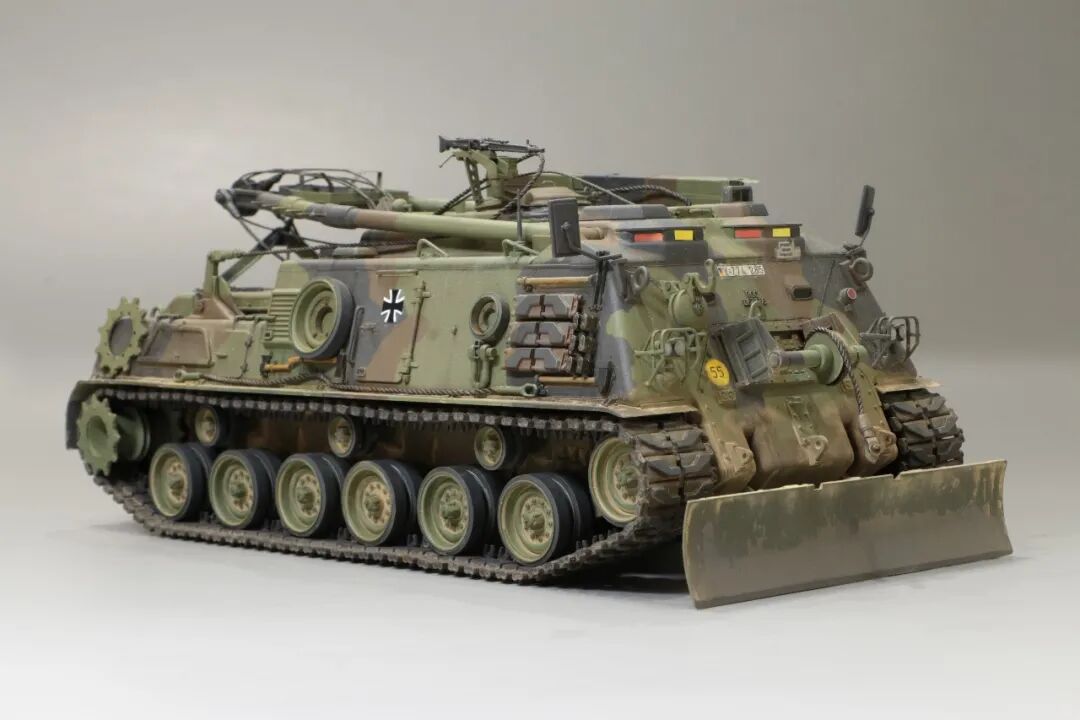 该车采用大陆公司(Continental)AVSI-1790-6A型12缸风冷喷射式汽油机。1972年4月,该公司接受了美国陆军的一项设计M88改进型车辆的合同。1973年,该车改用泰莱达因·大陆汽车(Teledyne Continental Motors)公司的AVDS-1790-2DR 12缸柴油机,功率为551kW(750马力),此外,还匹配了改进的传动装置并进行了其他方面的改进。改造后车辆定名为M88E1,1975年3月又定名为M88A1。从1977年开始该车连续生产,到1989年陆军接受最后一批M88A1时共采购2148辆,另外有878辆M88需要改造,总数为3026辆。今天分享的是德国的M88G1,在美军M88A1基础上加点零件,吊臂也不同,具体的差异小编就不太懂了~