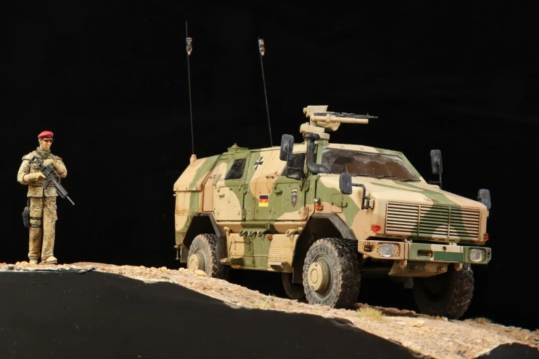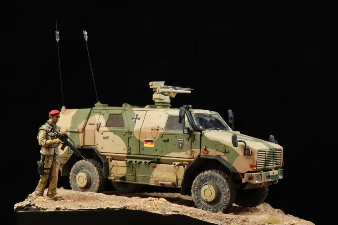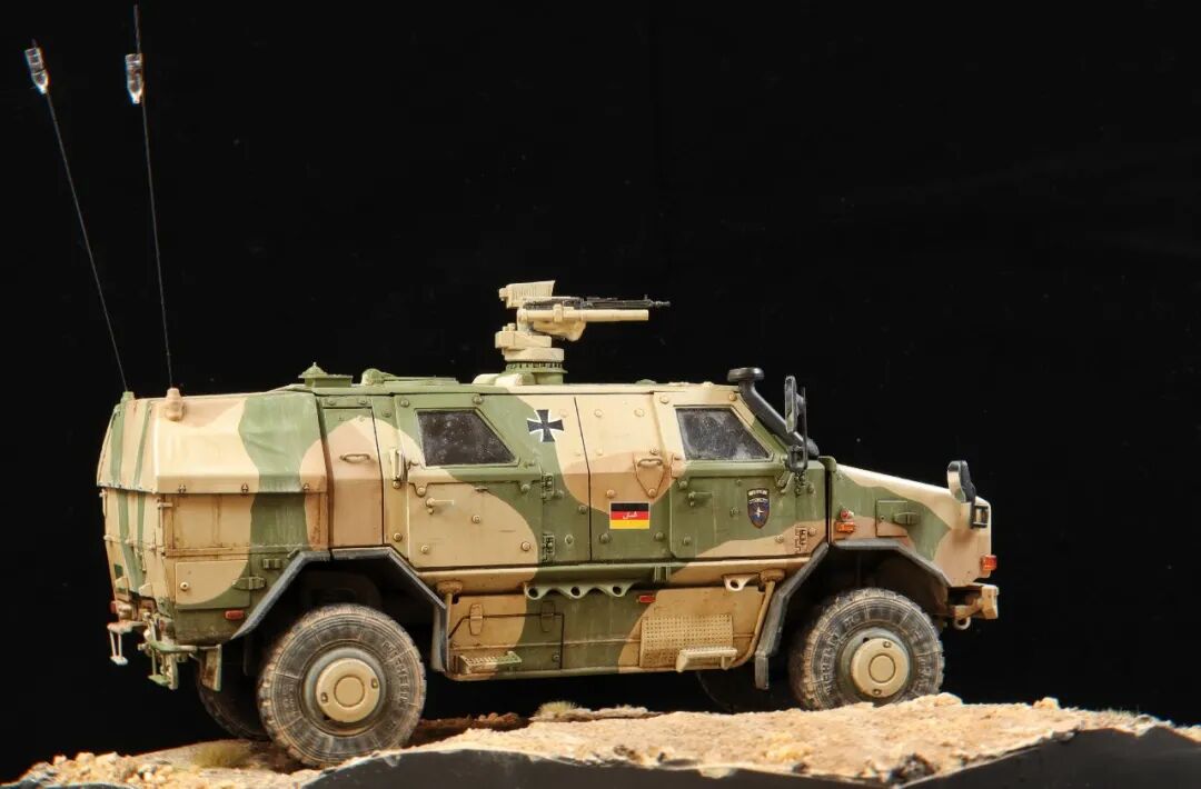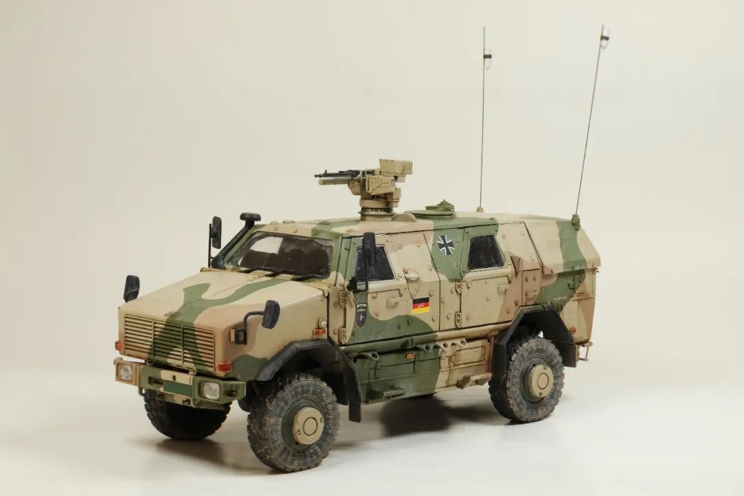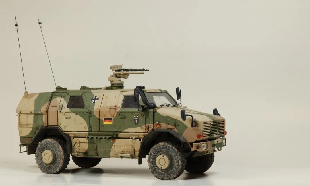 进入新世纪以来,德国陆军不断调整其作战任务与想定目标。冷战时期,德国陆军的主要作战任务是保卫德国及其盟友的领土安全;随着冷战结束和国际恐怖主义的肆虐,德国陆军的主要任务逐渐转变为:为国际危机管理提供军事支援。基于这种转变,德国陆军的任务定位和作战准备也发生了重大改变。这就要求德军陆军不但要具备独立作战能力,也必须具备在三军联合与多国协同作战的环境下,执行网络化作战任务的能力。为了具备这些能力,购买防护车便是德军主要方向之一,为满足多种任务的需要,这些车辆安装了种类繁多的辅助设备,如雷达系统、狙击手手侦测装备和简易爆炸装置干扰发射机,最具代表的就包括“野狗”2型装甲防护车、“美洲狮”步兵战车和“拳师犬”装甲运输车等。本期分享的作品就是目前德国陆军中发展最为“全面”、变型车种类最多的“野狗”2型装甲防护车。废话不多说,一起来欣赏吧!