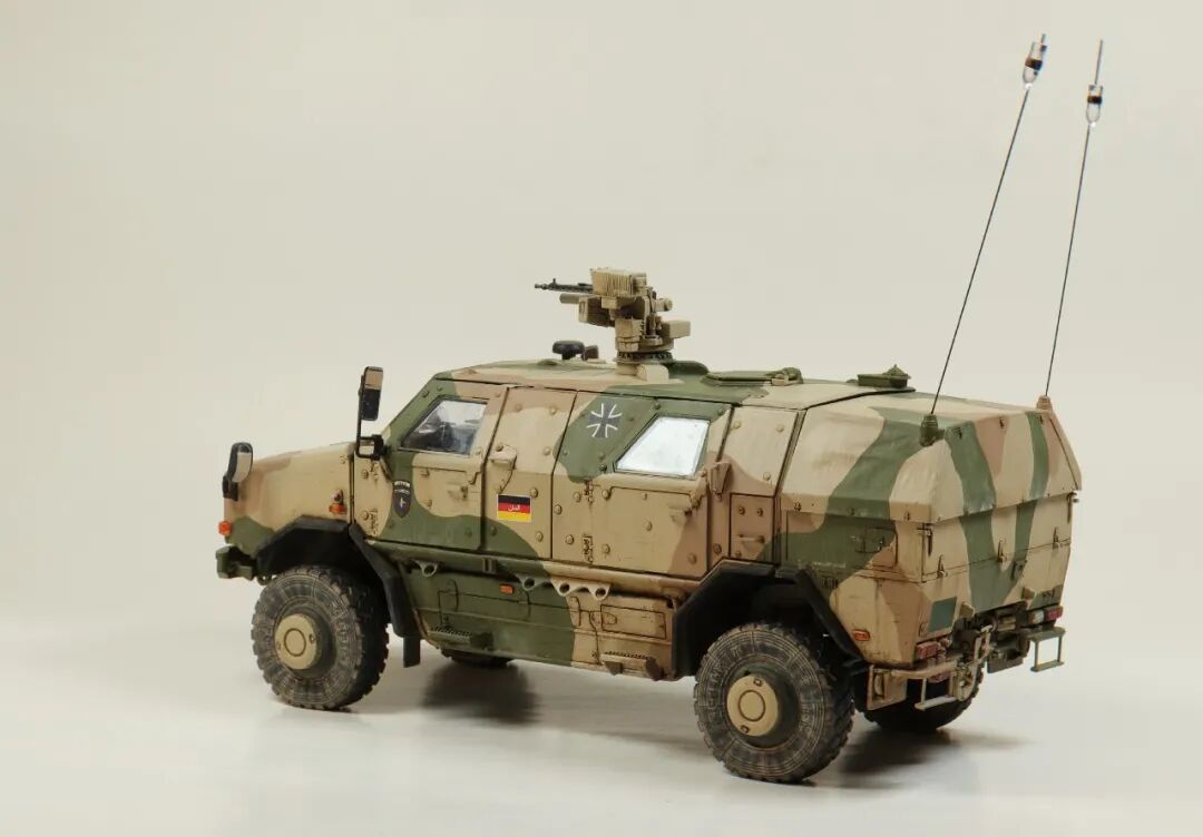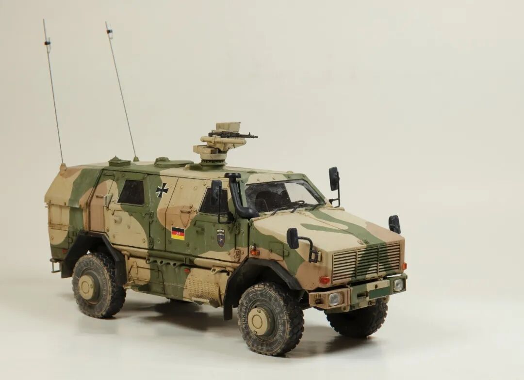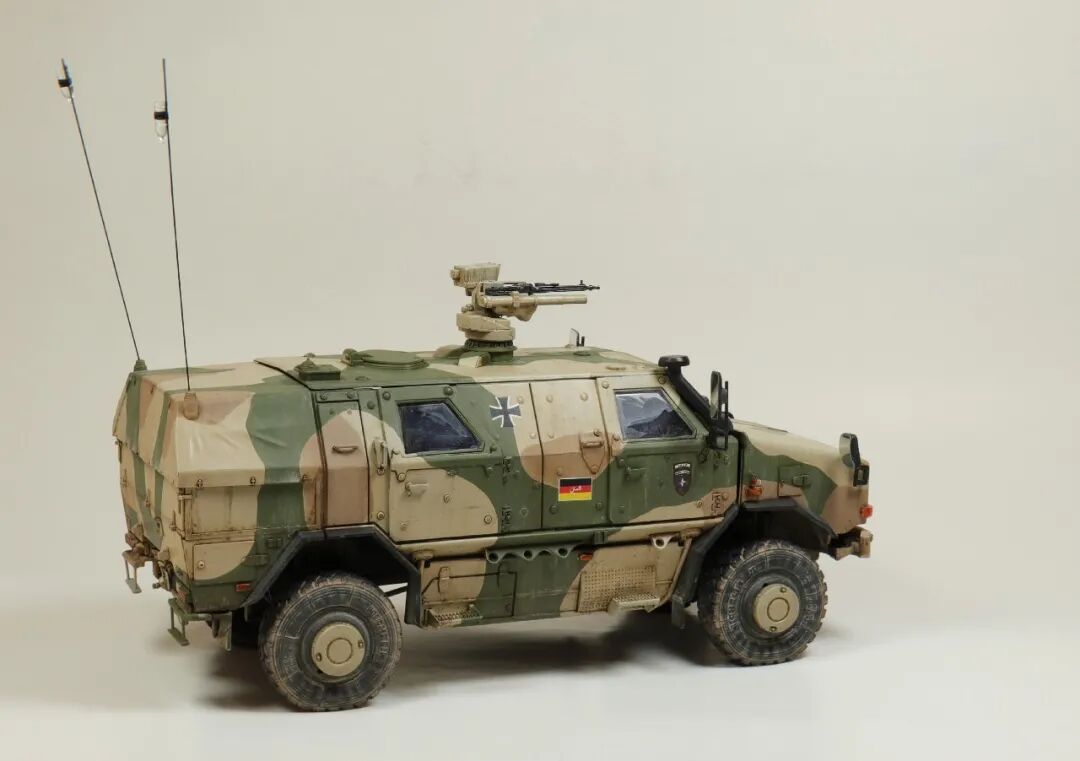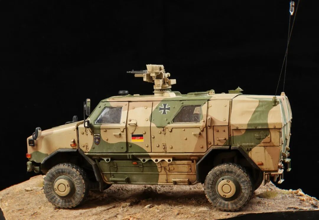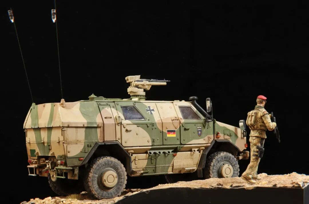 进入新世纪以来,德国陆军不断调整其作战任务与想定目标。冷战时期,德国陆军的主要作战任务是保卫德国及其盟友的领土安全;随着冷战结束和国际恐怖主义的肆虐,德国陆军的主要任务逐渐转变为:为国际危机管理提供军事支援。基于这种转变,德国陆军的任务定位和作战准备也发生了重大改变。这就要求德军陆军不但要具备独立作战能力,也必须具备在三军联合与多国协同作战的环境下,执行网络化作战任务的能力。为了具备这些能力,购买防护车便是德军主要方向之一,为满足多种任务的需要,这些车辆安装了种类繁多的辅助设备,如雷达系统、狙击手手侦测装备和简易爆炸装置干扰发射机,最具代表的就包括“野狗”2型装甲防护车、“美洲狮”步兵战车和“拳师犬”装甲运输车等。本期分享的作品就是目前德国陆军中发展最为“全面”、变型车种类最多的“野狗”2型装甲防护车。废话不多说,一起来欣赏吧!