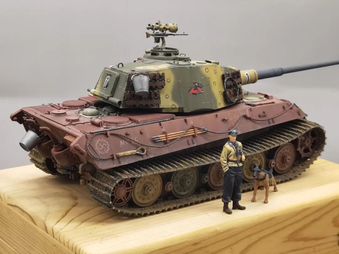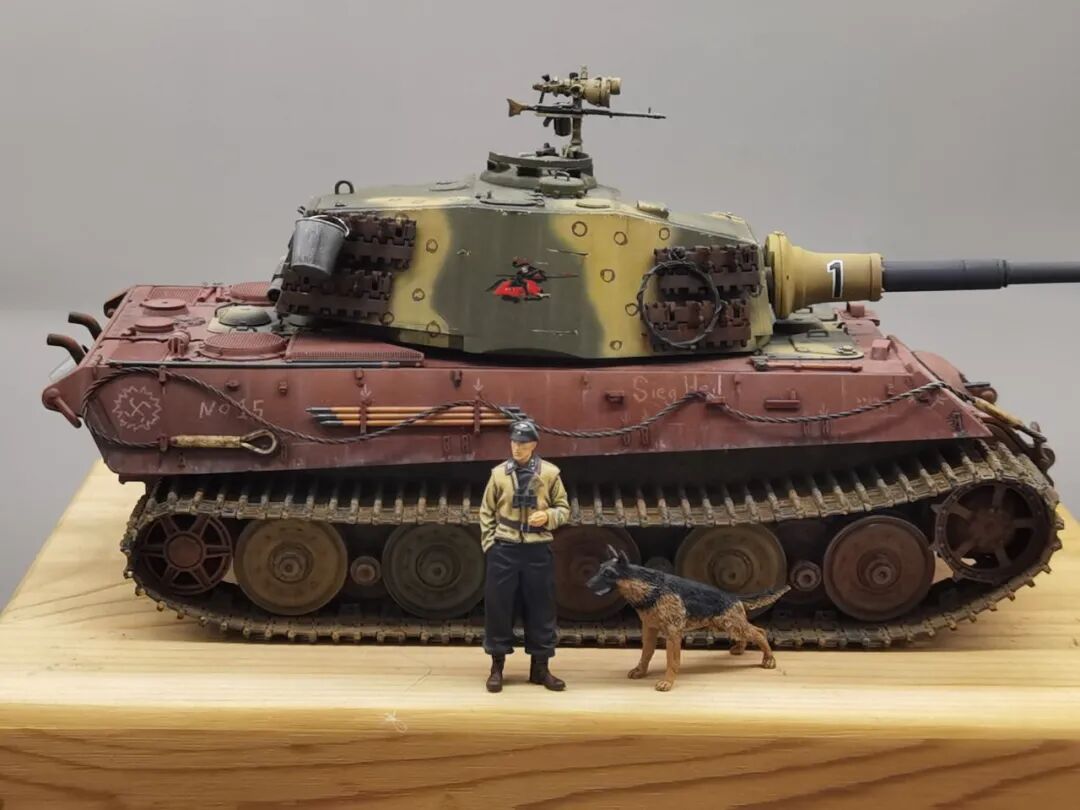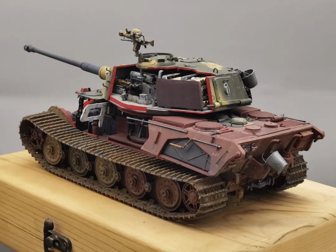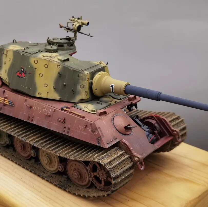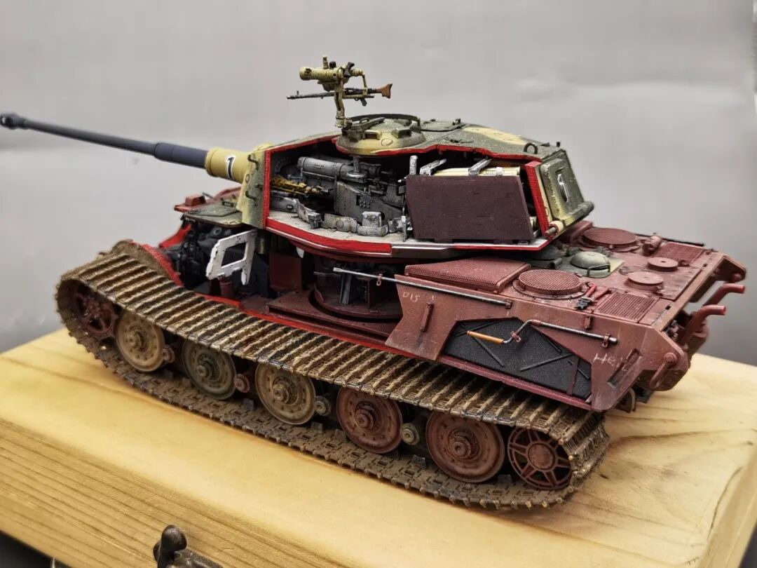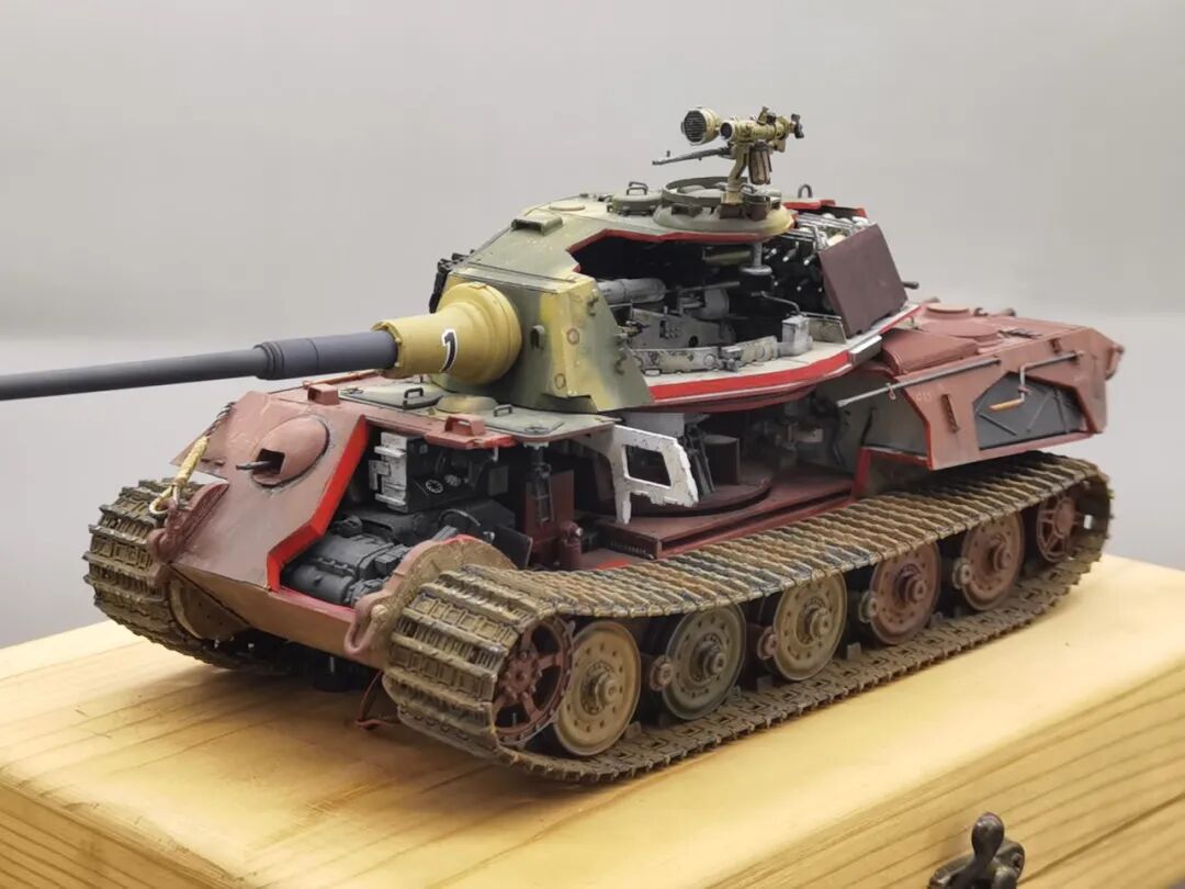第一次投稿,不知道发个什么作品,就以这个解剖版虎王打头阵吧。整个作品是用了meng的虎王内购板件,首先做了板件切割,以方便观察内购,换了金属履带,然后整个虎王做了RC改造,有发烟,有风扇转动,有发动机抖动,有灯光,有音箱,可惜照片没法展示。作品涂装选用了末日涂装,旧化也是因为RC的原因没下重手,整个工期用了大半年,最后加了一个兵人和一条狼狗,作品也参加了2021的元旦赛。