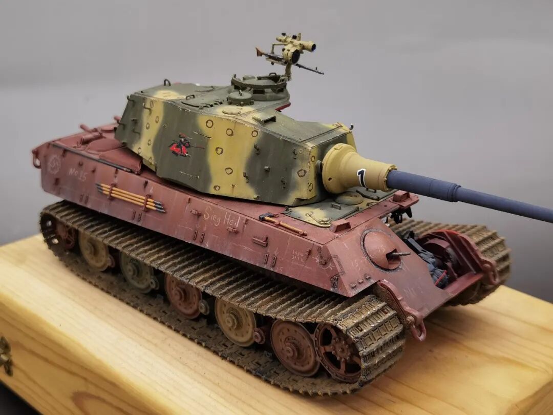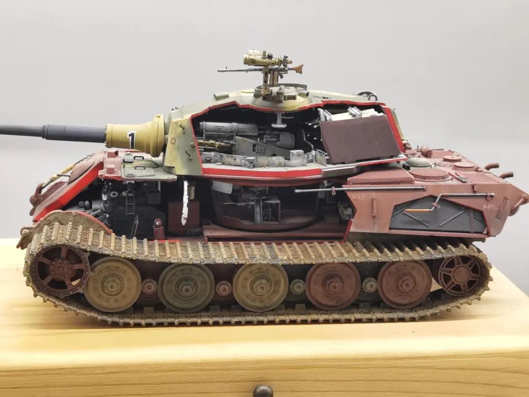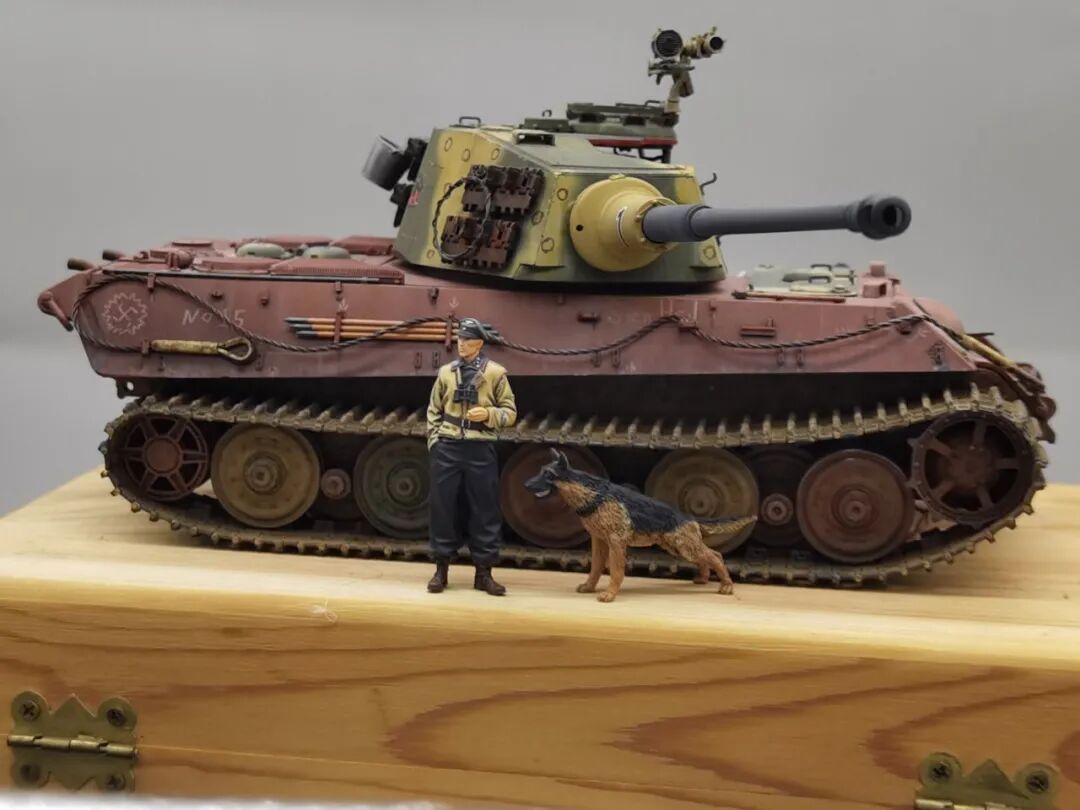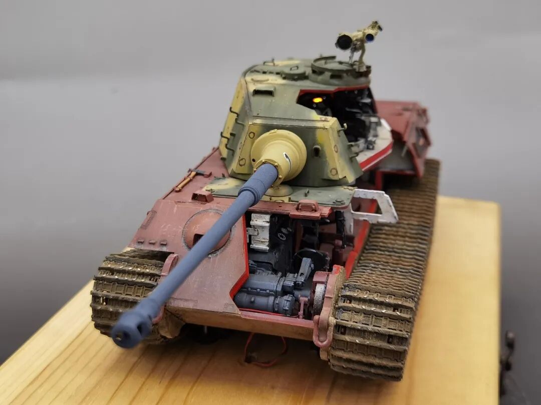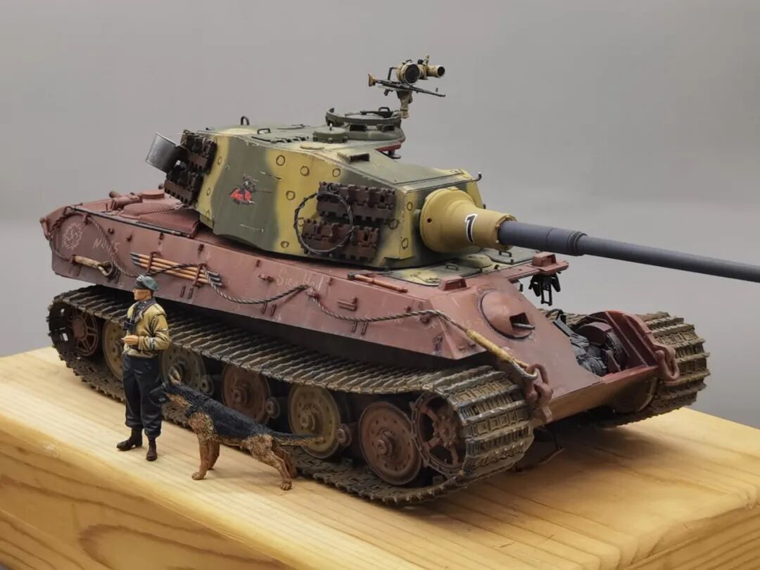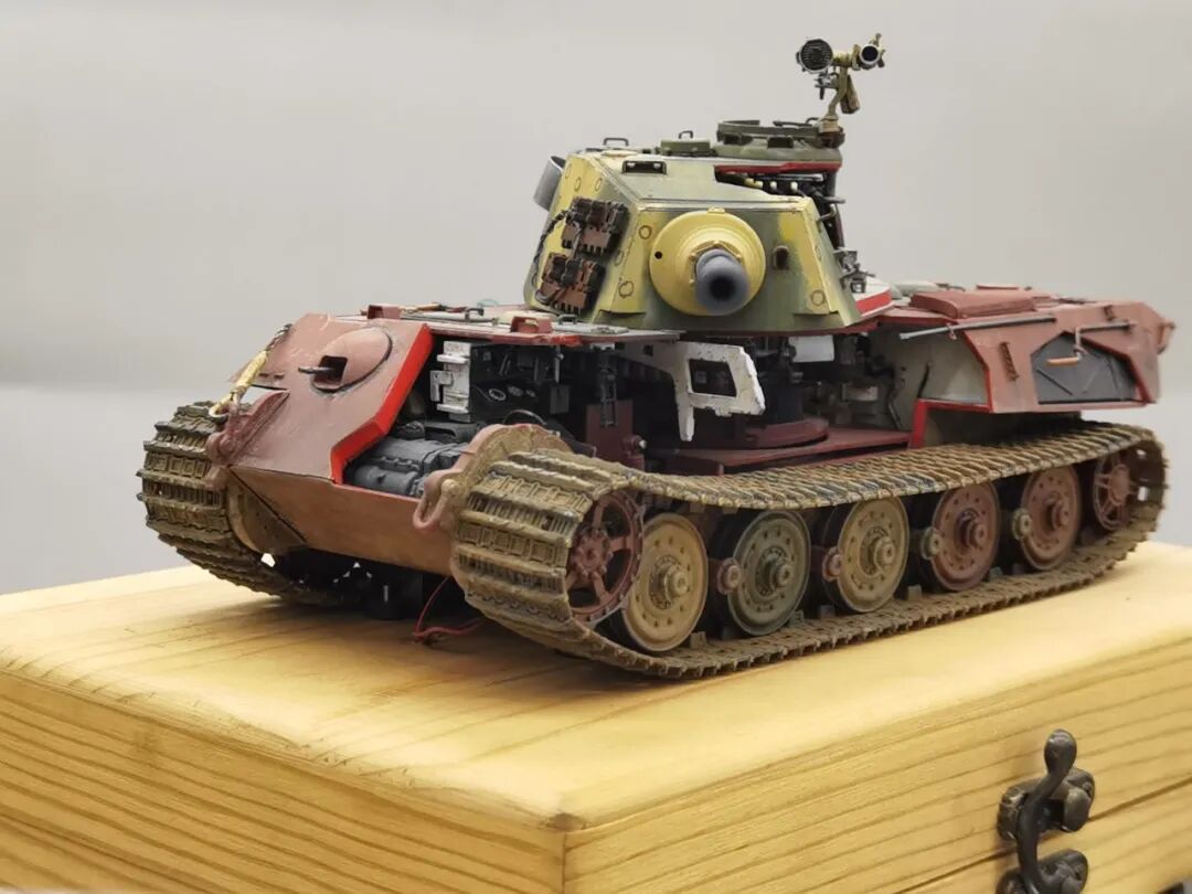 第一次投稿,不知道发个什么作品,就以这个解剖版虎王打头阵吧。整个作品是用了meng的虎王内购板件,首先做了板件切割,以方便观察内购,换了金属履带,然后整个虎王做了RC改造,有发烟,有风扇转动,有发动机抖动,有灯光,有音箱,可惜照片没法展示。作品涂装选用了末日涂装,旧化也是因为RC的原因没下重手,整个工期用了大半年,最后加了一个兵人和一条狼狗,作品也参加了2021的元旦赛。