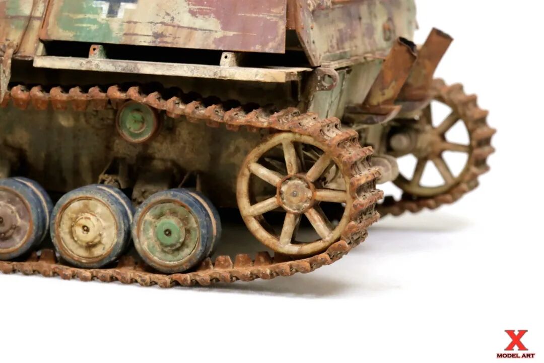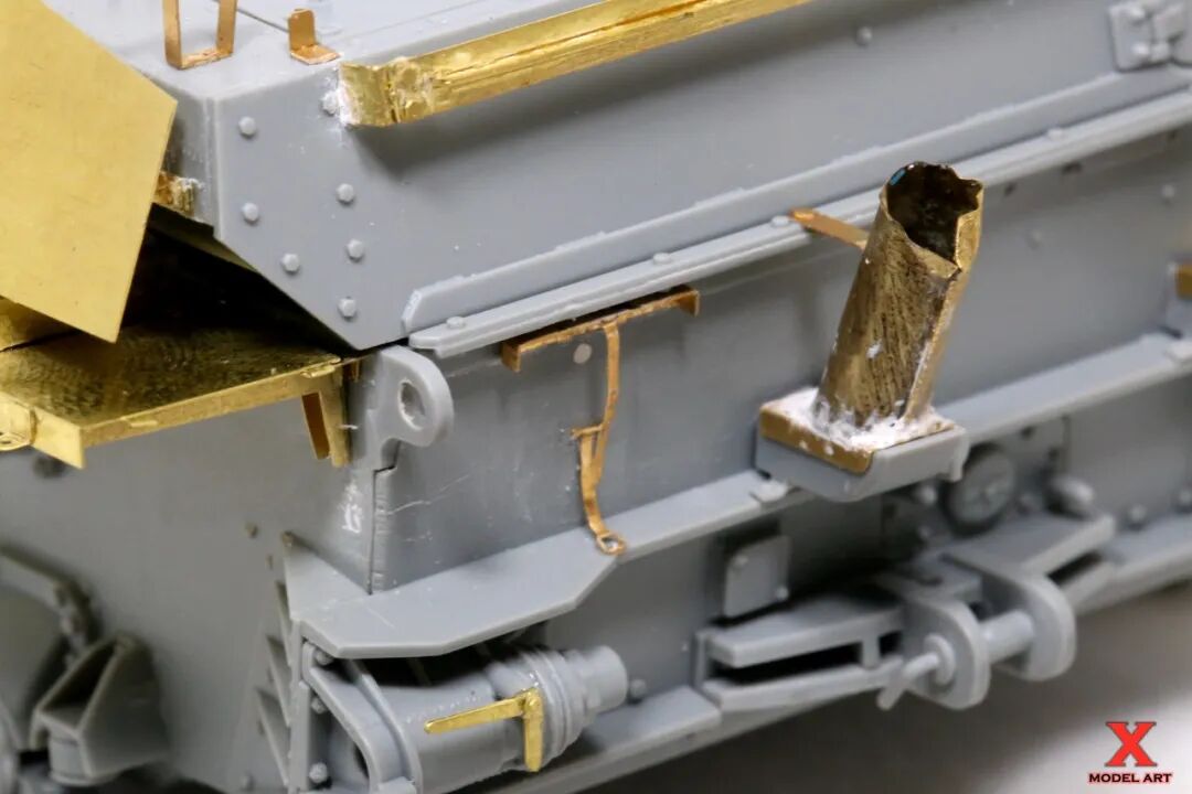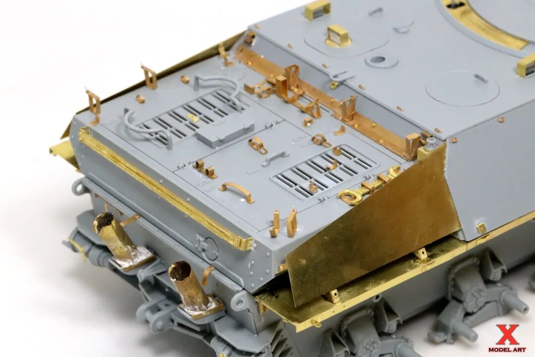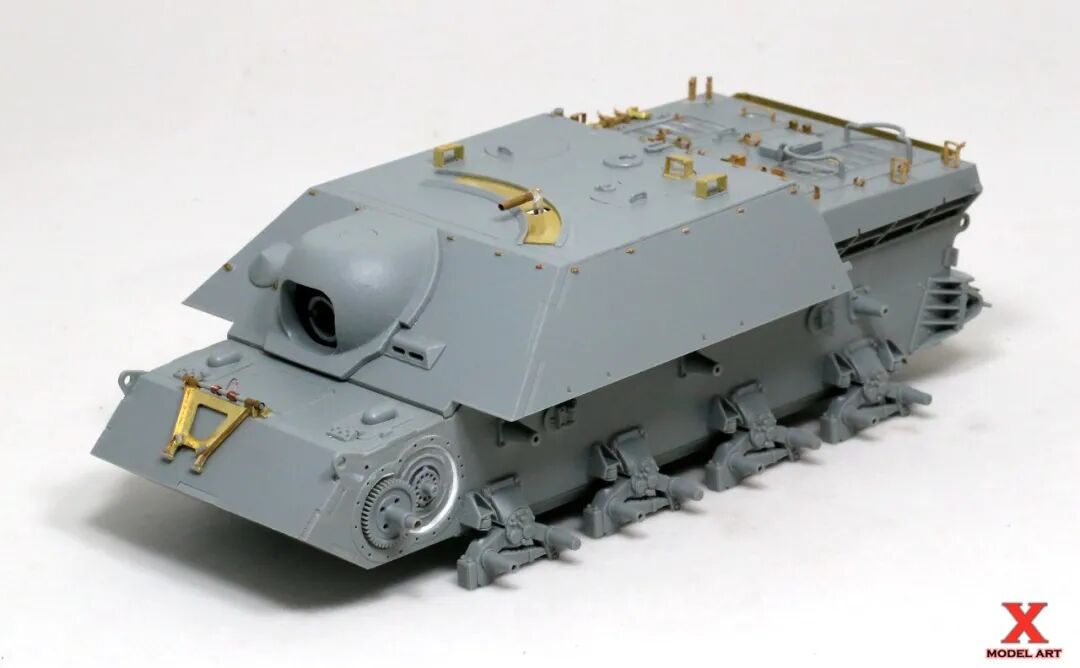 本车的上部结构采用倾斜装甲设计,可以较薄的装甲厚度提供较大的防御效果,同时前部装甲的厚度达到100mm。为了尽可能简化生产流程,本车的上部结构系制作成具有楔形连结部的装甲板,再焊接起来~