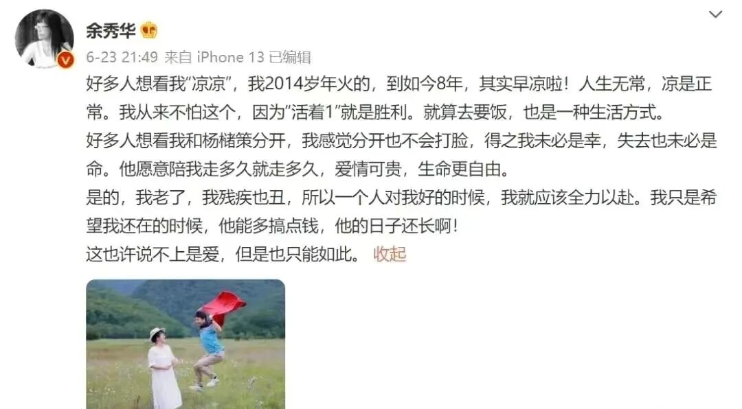 然而,余秀华又清醒地认识到,这份所谓的感情是不会长久的,她在官宣他们恋爱的时候就预设了它的结局。是她没想过天长地久吗?有可能吧。我以为更多的可能是,余秀华人间清醒,知道这不会长久,为了将来分开的时候不被打脸,她提前打了预防针:“我感觉分开也不会打脸,得之我未必是幸,失去也未必是命。”