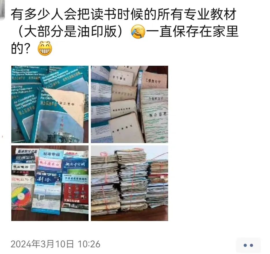 前几天,一位今年从大学老师岗位上退休的大学校友在朋友圈里发了这样一条状态:保留着撂得整整齐齐的大学读书时的专业教材,还有毕业设计材料和实习时候的材料。