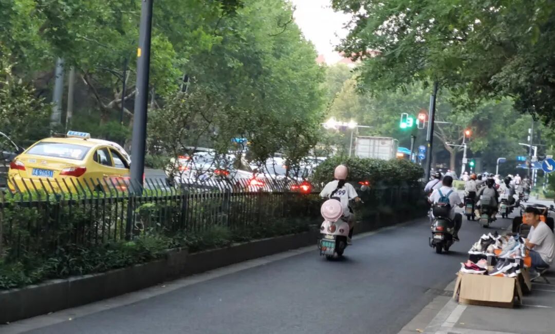 傍晚散步,红绿灯口,一辆电瓶车停在人行道上,电瓶车旁边摆了个简易摊位在卖运动鞋。