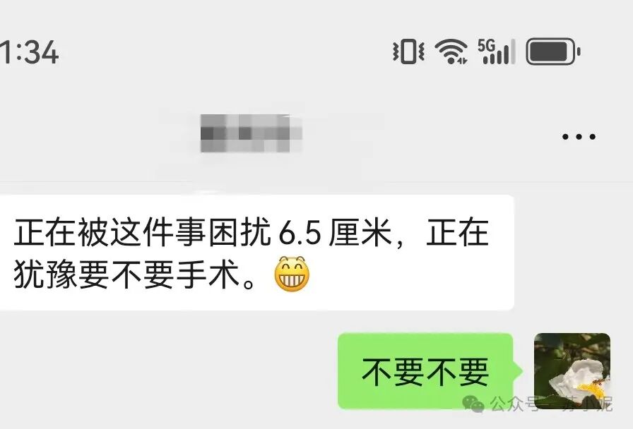 之所以聊过又聊这个话题,是因为昨天一位朋友看到我的公众号之后给我留言,她也正为此事踌躇要不要手术。她那个瘤跟我的差不多大,年龄比我略小几岁。没碰到过这种情形的人,自然会担心纠结,如果医生又有一些导向性的语言提示,患者内心可能就更害怕或者纠结。