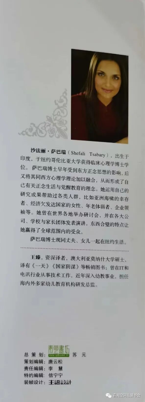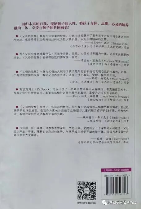 《父母的觉醒》是哥伦比亚大学临床心理学博士、教育专家沙法丽·萨巴瑞博士以心理学领域的研究成果为依托,以唤醒父母,指导父母回归本真,以享受的心态、智慧的方法,将孩子身体、思维、心灵的培养融为一体,享受孩子成长的每一个本真过程为己任的作品。本书开篇,就以直击心灵的方式给为人父母的我们一锤重击,原来我们都在不知不觉中以一种不清醒的“自负感”在教养我们的孩子。我们对待自己的孩子,甚至还不如对待我们的工作用心,而充满本真、活力四射、想象力丰富的孩子们,可能在我们一次又一次的不觉醒言语行动中,惨遭打击,深受其害。