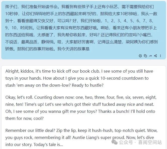 说干就干,方案一出,文案就写起来了。练习几天后发现,好处陆续有来。比如,这两天,在朗读译文时,大脑还会自动搜寻教案素材,为新的词汇添加具象化的视频素材,帮助孩子更好的理解;或者为互动环节添加符合孩子们特性的激趣点,让孩子更乐意参与其中。没想到,原来单一维度的教案设计,经过英语拉链这么一联结,居然达到了更多元的效果,用一份时间,同时完成了英文朗读素材的准备、故事会互动素材预演、教案完善与提升、变单一的语境为中英双语语境等多项目融合,假以时日,甚至有可能带动其他带读老师一起跟进实施……