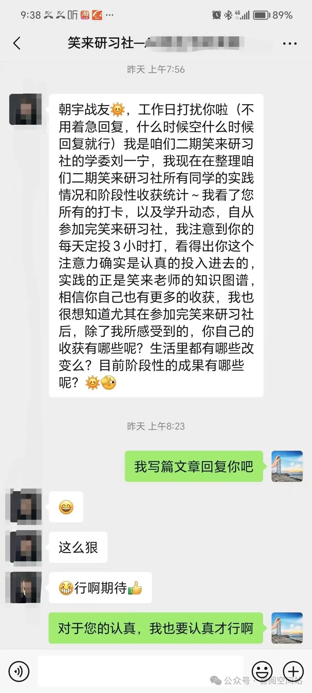 研习社,是社群成员通过自愿预交199元押金,完成9份打卡任务押金全数返还的方式展开的。换句话说,参与研习社的人,都是真想通过自身努力,学有所成的人。这些人,都非常的自律自觉,自觉地写感思,自觉地截图分享。每日打卡任务是300字以上,但据我观察,每日打卡字数在2000字以上的,也不在少数。其中不少人,真的是借学习任务,非常细致地对比和分析所学知识与自己日常行为之间的差别,今后自己如何优化和提升。