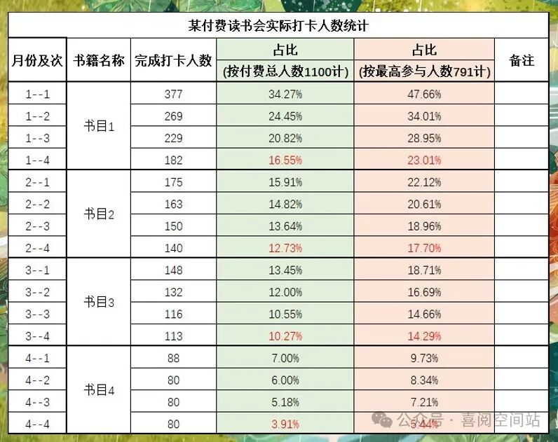 前面提到的读书会,是需要付费的,按理说,参与的都是有足够意愿,想认认真真读书的人。这样的群体,保守估计,占比不超过成人总量的1/10;但从打卡数据看,真正能投入心思去看、去写的,占比远远低于1/10