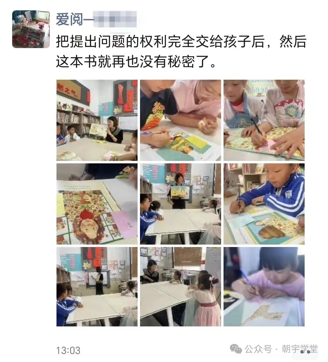 关于作者:朝宇,勤于探索和培养儿童自学能力的“思想家”;成人共学社群的组织者具有多年绘本带读经验,具备整本文字书带读能力是深圳爱阅公益基金会2024年阅读推广人培训课程的共学讲师用通俗易懂的方式分享家庭教育、亲子成长、终身发展的悟与行欢迎你的关注、回应和交流