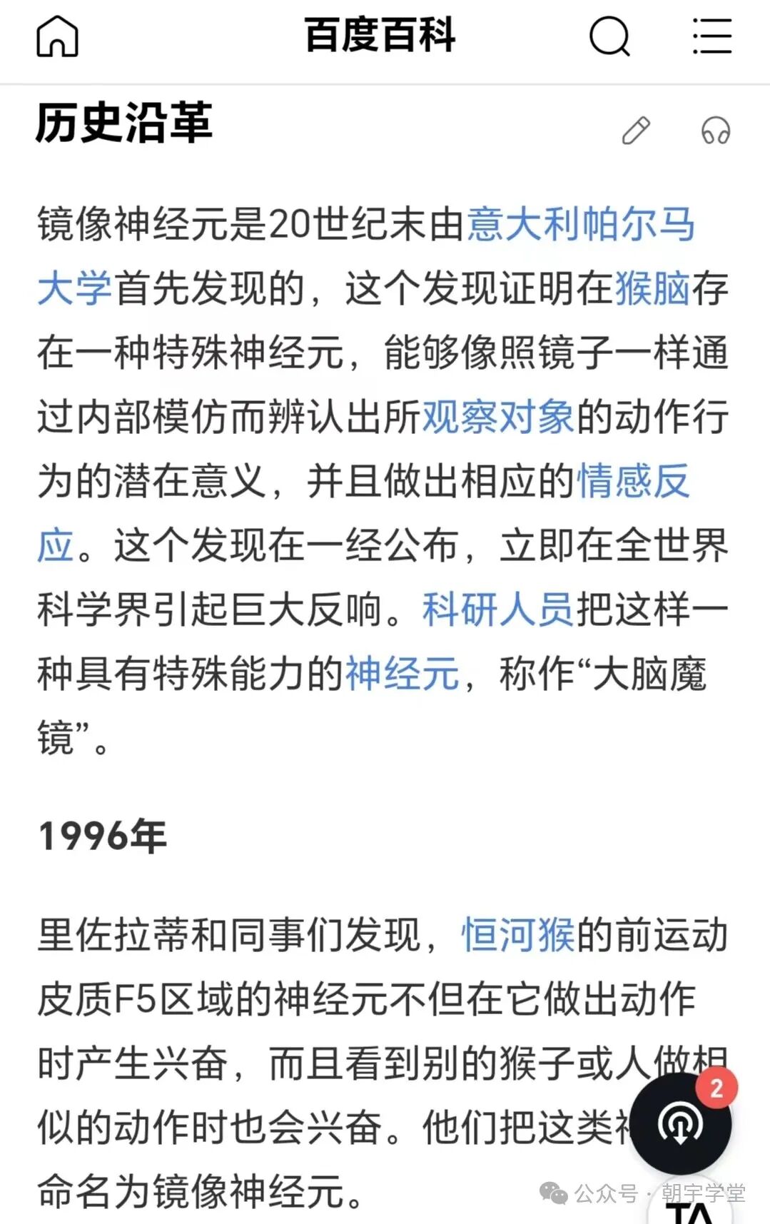 下图是百度百科关于镜像神经元的科普知识。用一句话提炼其主旨就是镜像神经元细胞,能够让旁观者像照镜子一样自发习得自己所看见的动作,并作出相应的情感反应。