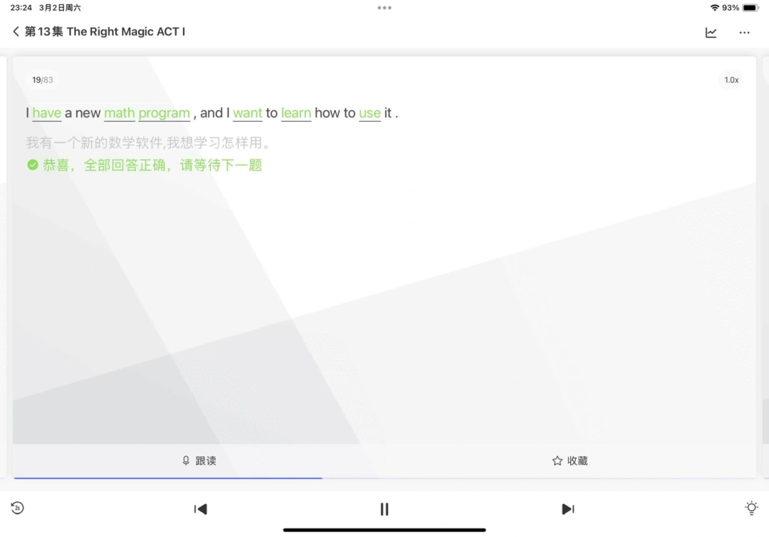 听了无数遍之后再听写,熟悉熟悉,还是熟悉,特别丝滑,特别有成就感。因为句子简单,听写容易,掌握程度可量化,学习兴趣更浓。