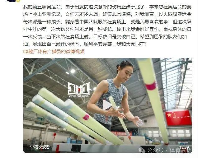 她在个人社媒上遗憾表示:“我的第五届奥运会,由于出发前这次意外的伤病止步于此了。本来想在奥运会的赛场上冲击亚洲纪录,奈何天不遂人愿,确实非常遗憾。对我而言,过去四届奥运会每次都是一种成长,能穿着中国队队服站在赛场上,就是我最喜欢的事,但这次职业生涯的第一次大伤又何尝不是另一种成长。接下来我会好好养伤,重视身体的每一次反馈,当下次站在赛场上时,目标依旧是突破自己。希望到巴黎的队友们加油,展现出自己最佳的状态,顺利平安完赛,我和大家同在!”