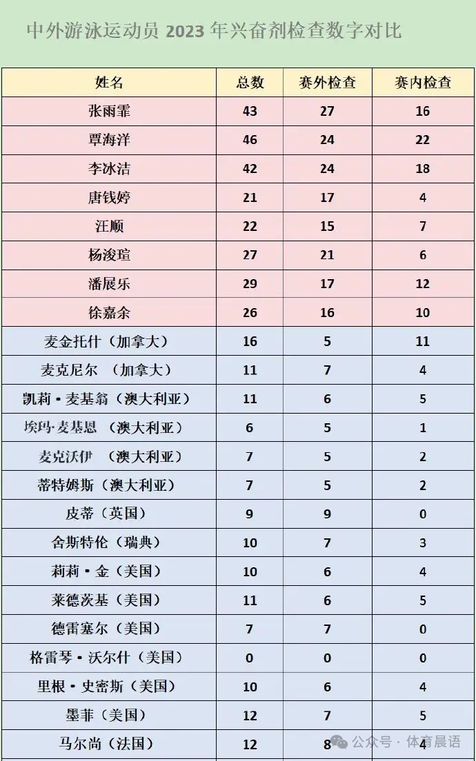 从这些数据来看,中国游泳队确实是遭受到了很不公平的对待。这一点,从年初被曝出的所谓23名中国游泳运动员呈阳性的消息就能看出来。现在的中国游泳队,确实成为了欧美游泳界的处处针对。在中国游泳队抵达巴黎后,就遭遇到了史无前例的区别对待。中国国家游泳队营养师于良在社媒上表示:“来法国正好10天,这10天里,我们31名运动员除了训练,倒时差,还累计被ITA查了接近200人次兴奋剂,平均每天接近20人次,每人平均被查5-7次。早晨6点还没睡醒就来了,中午午休也来,没办法只能在酒店大堂沙发休息,晚上九点多还来要一直熬到下半夜…”