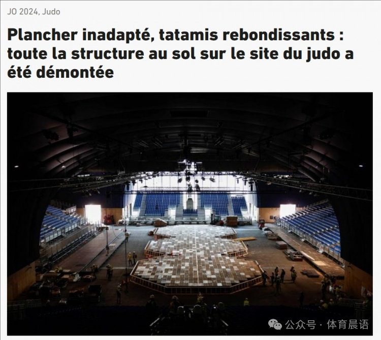 据法媒《队报》报道,巴黎奥运会柔道比赛场地的地板因不符合要求被要求于本周重新铺装。巴黎奥运会比赛场馆之一战神广场为临时场馆,将于7月27日至8月3日期间举办柔道比赛。本周三,该比赛场地地板被拆除,原因是用于铺设榻榻米的地板不合适,垫子反弹度大,密度也有差异,目前已订购新的地板,并于昨晚开始安装。