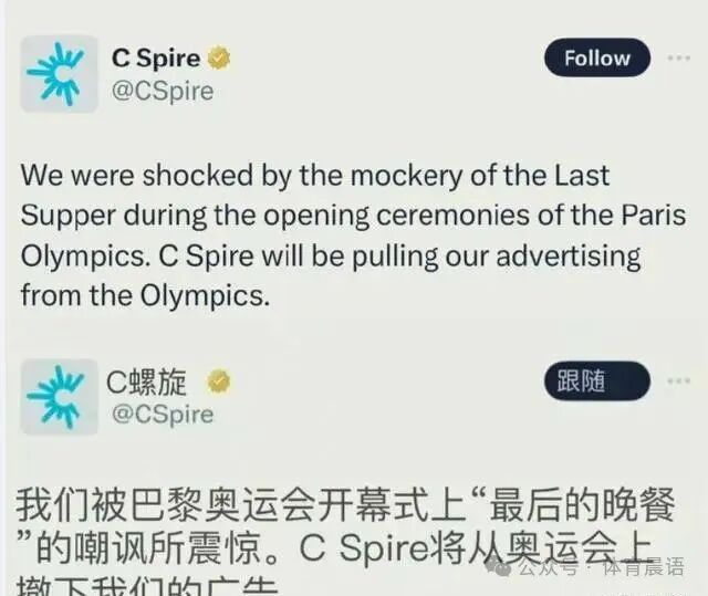 不过,这两件事虽然是一个大笑话,但对于赞助商来说,并不会构成他们撤出赞助广告的理由。真正让他们感到愤怒的是开幕式中所体现出来的一些因素,让他们彻底怒了。巴黎奥运会赞助商之一、美国科技公司C Spire在社交媒体上宣布,因为开幕式对基督教和宗教的不尊重,尤其是LGBT团体代表模仿达芬奇名画《最后的晚餐》,所以这家公司宣布将撤出自己在奥运会期间的所有广告。“巴黎奥运会开幕式上对『最后的晚餐』的嘲讽令我们感到震惊。本公司将撤出我们在奥运会期间的所有广告。”密西西比州州长泰特·里夫斯在消息公布后发表了看法。“我很自豪地看到密西西比州的私营部门站出来并采取了下架行动。上帝不会被嘲笑。CSpire 画了一条符合常识的、恰当的路线。”