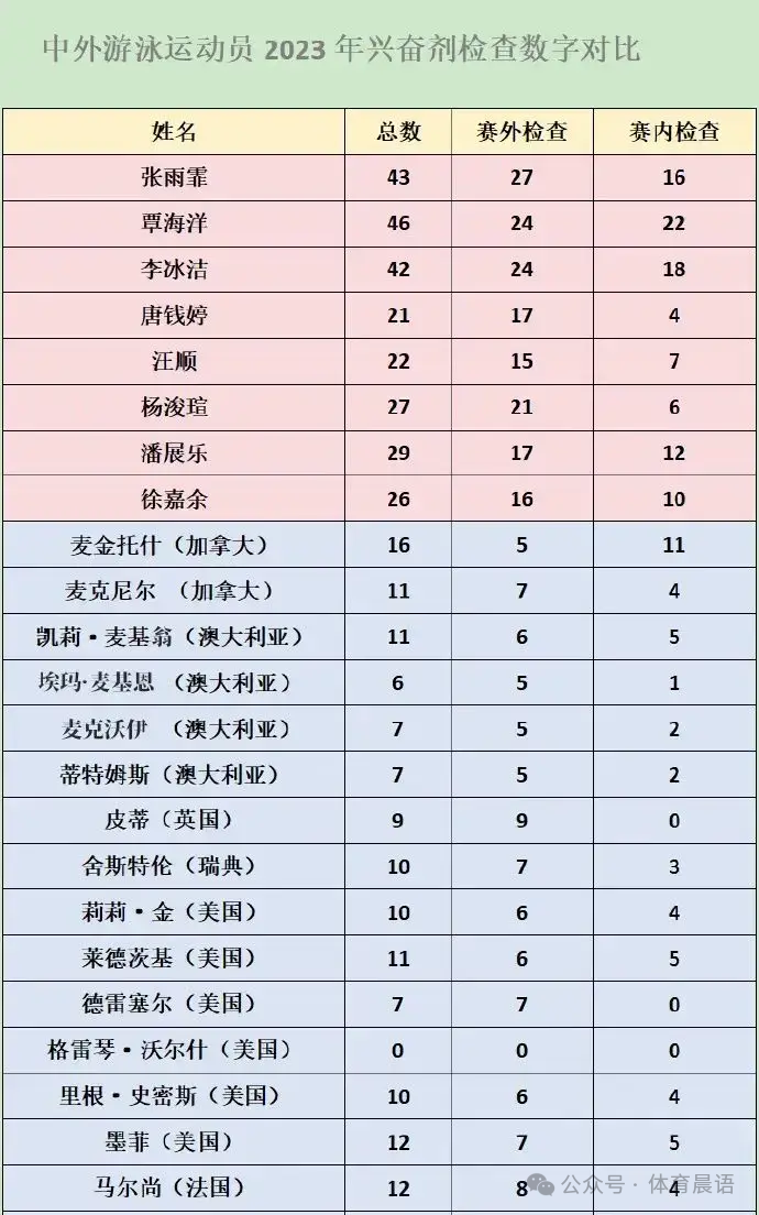 而与之相对的,则是欧美游泳运动员兴奋剂的检测次数。同期美国46名游泳运动员,人均检测只有6次,而澳大利亚41名游泳运动员人均次数更少,只有4次。另外,如意大利、英国、法国等欧美游泳选手超过20人的游泳队,人均的检测都只有4—5次。