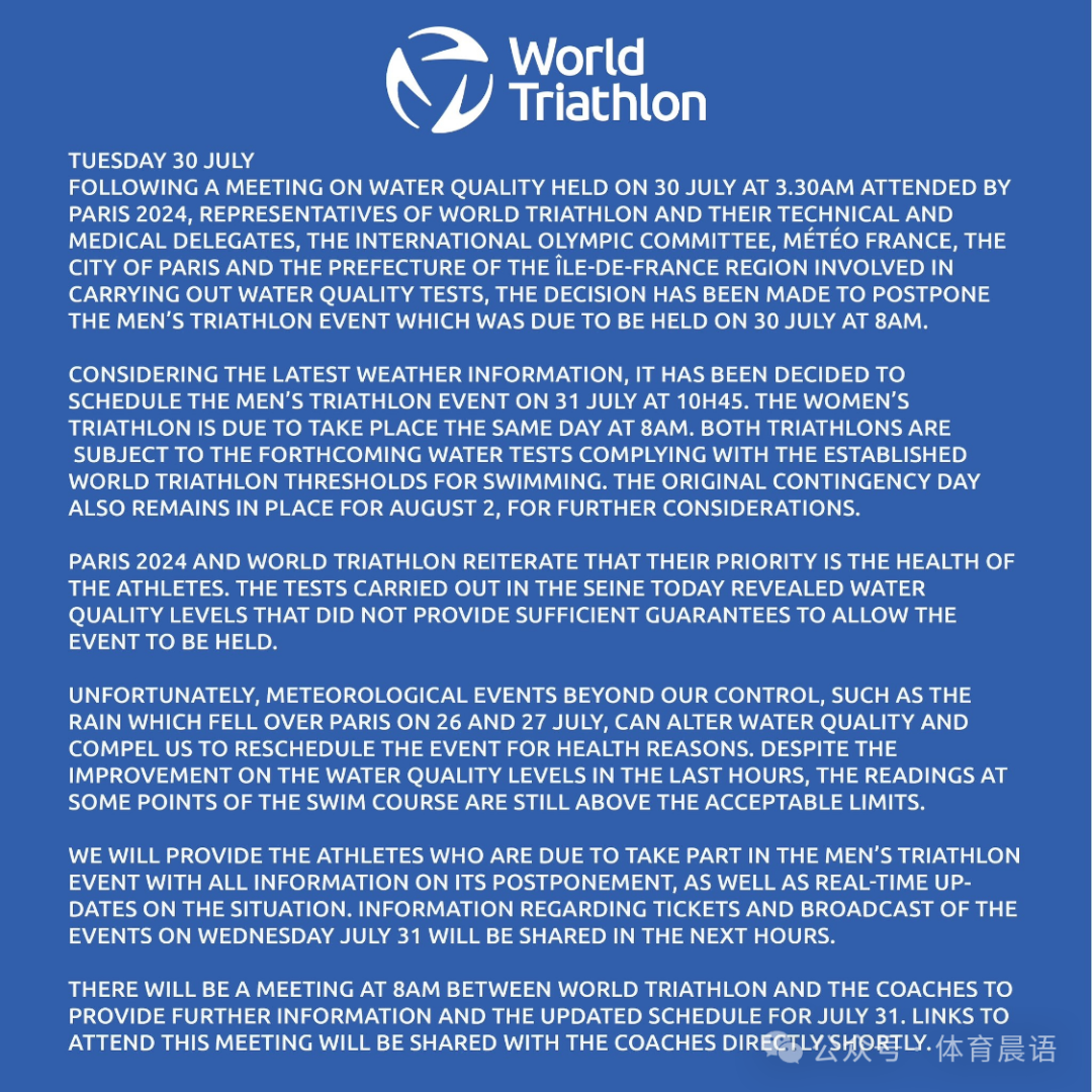 巴黎奥运会正在火热进行中,对于参赛的选手们来说,一般都会按照奥运会的既定赛程来进行安排和训练,以便将自己的最佳状态调整到正式比赛的那一天。然而,日前巴黎奥运会官方发布的一则声明,却让参加巴黎奥运会的铁人三项运动的参赛选手们集体无语。