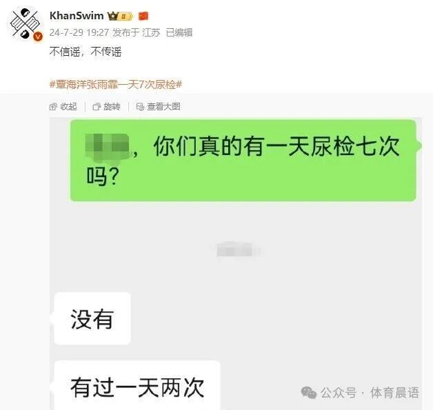 那么,中国游泳队是不是真的如传闻中所说的那样,每天人均七次兴奋剂检测?日前,针对中国游泳队一天尿检7次的传闻,游泳博主“KhanSwim”在社媒进行了辟谣。游泳博主“KhanSwim”向中国游泳队内部人士求证,“你们真的有一天尿检七次吗?”得到的答复则是“没有,有过一天两次。”