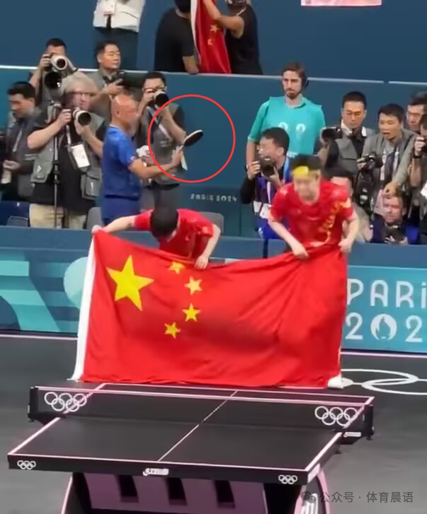 从现场球迷传来的视频可以看到,在混双决赛的比赛结束后,王楚钦与孙颖莎还有教练组的人一起在庆祝。王楚钦当时将自己的球拍入在场边,然后与孙颖莎一起同国旗合影。这个时候,很多的媒体记者一拥而上前来拍照。而王楚钦的球拍则被其中的一名摄影记者给踩坏了。后面证实,这位摄影记者是巴黎奥运会的官方场地摄影记者。