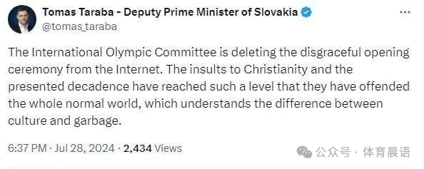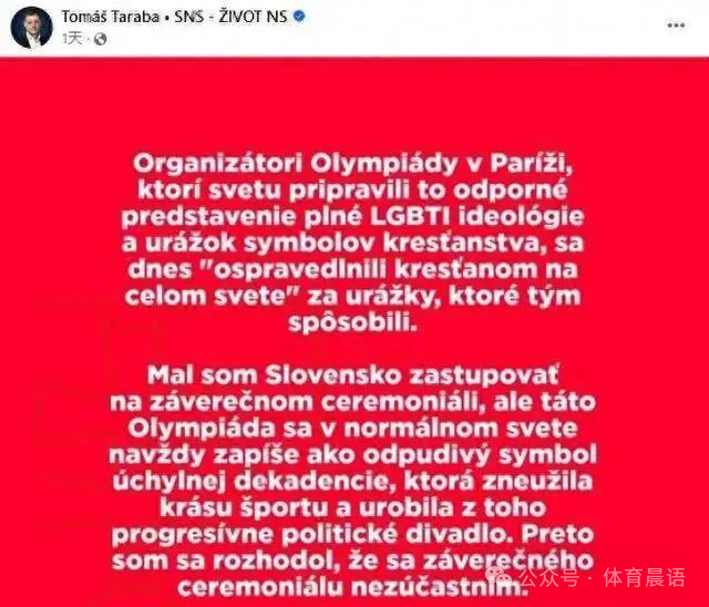 而这个质疑声如今演变成了有欧洲领导人拒绝出席巴黎奥运会闭幕式,从而以行动表示抵制。据国内多家权威媒体及俄媒“今日俄罗斯”(RT)近日的报道,斯洛伐克副总理托马斯·塔拉巴(Tomas Taraba)近日在个人社交媒体上怒斥本届奥运会将成为历史耻辱柱上“堕落与颓废”的象征,宣布拒绝出席巴黎奥运会闭幕式。报道中表示,塔拉巴在社交媒体上写道:“我本该代表斯洛伐克出席闭幕式,但对于正常的世界来说,这届奥运会将永远是堕落、颓废的象征,它滥用了体育之美,将其变成了所谓进步的政治舞台。因此,我决定不参加闭幕式。”