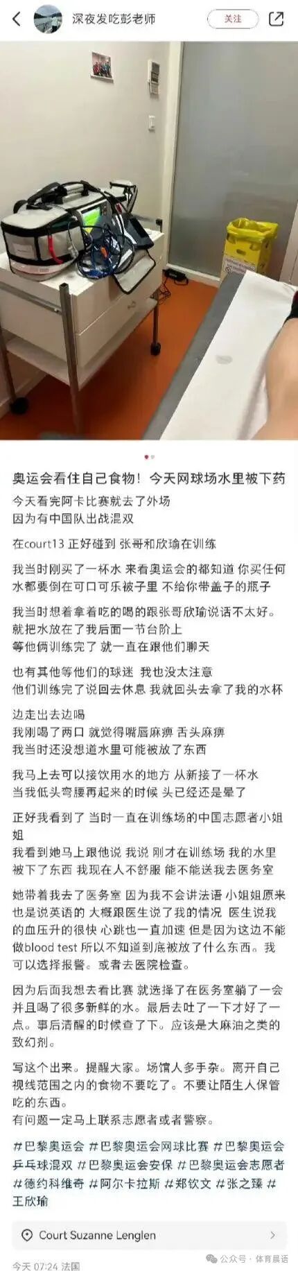 而更让人无语的是,一位知名博主“深夜发吃彭老师”则透露了巴黎奥运会期间的惊悚事情。从长文中,该博主表示自己正好碰到张之臻和王欣瑜在训练。他买了一杯水,想着拿着水和张之臻还有王欣瑜说话不太好,所以他就将水放在后面一节的台阶上,等这两位网球运动员训练完,一直跟他们聊天。当时,除了他自己,还有一些在场的球迷。等张之臻和王欣瑜训练完说回去休息,这位博主就回头去拿自己的水杯,一边走一边喝。结果只喝了两口,就感觉到嘴唇和舌头都在发麻。当时,他还没觉得这是水里被下了药。所以他将水倒了重新去接了一杯水,结果接水的时候,头还是晕的。后面他才意识到这是水里被下了药,于是他马上请一位一直在训练场的中国志愿者带他去医务室,后面在医务室吐了才好一点。