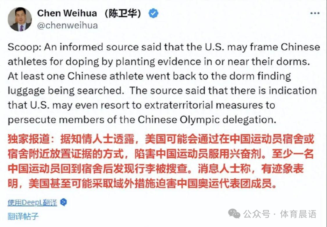 在表示美国可能会在中国运动员的宿舍或宿舍附近安插“证据”,以栽赃中国运动员使用兴奋剂的同时。陈卫华的消息中还透露,目前至少已经有一名中国运动员,在回到宿舍后发现自己的行李被人搜查过。该消息人士还称,有迹象表明,美国甚至可能采取域外措施迫害中国奥运代表团成员。