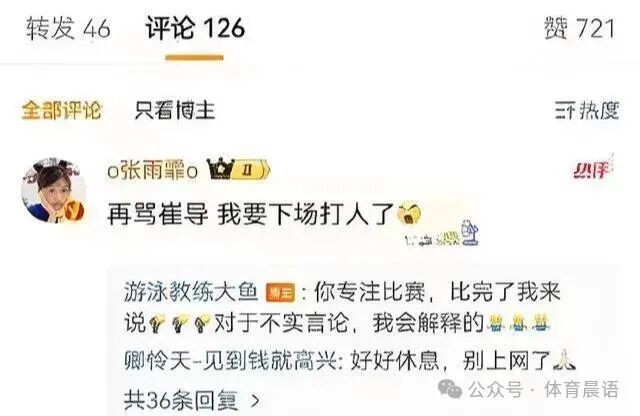 而在日前,崔登荣的助理教练大鱼在社交媒体上发布了关于王长浩生病发烧的动态,而这一张动态更是将网友们对崔教练的质疑声进一步扩大。不少网友在网上直接对崔教练发出质疑声,并且更多的网友也加入了进来。在看到这样的情况后,一向好脾气的张雨霏看不下去了,亲自上阵,在社交媒体上与网友进行回怼,霸气维护崔教练:“再骂崔导,我要下场打人了。”在看到张雨霏怒了后,助理教练大鱼也进行了回应:“你专注比赛,比完了我来说。对于不实言论,我会解释的。”