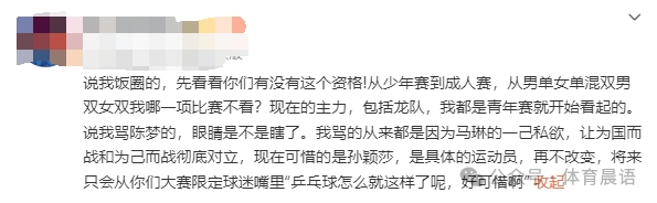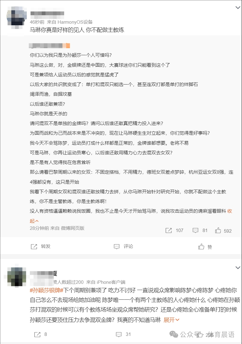 这位博主表示:“你们以为我只是为孙颖莎一个可惜吗?马琳这样做,金银牌还是中国的,可是兼项给人运动员以后的感觉就是猛虎了。以后大家的共识就变成了:单打和混双只能选一个,甚至连双打都是单打的绊脚石。以后谁敢兼项呀。““请问混双不是单独的金牌吗?请问以后谁还敢真把精力投入进来?”“我今天不骂陈梦,运动员打成什么样都是正常的,金牌谁都想要,老将不易。可是马琳,你再让运动员寒心,以后谁还敢用精力心力去混双去女双。”