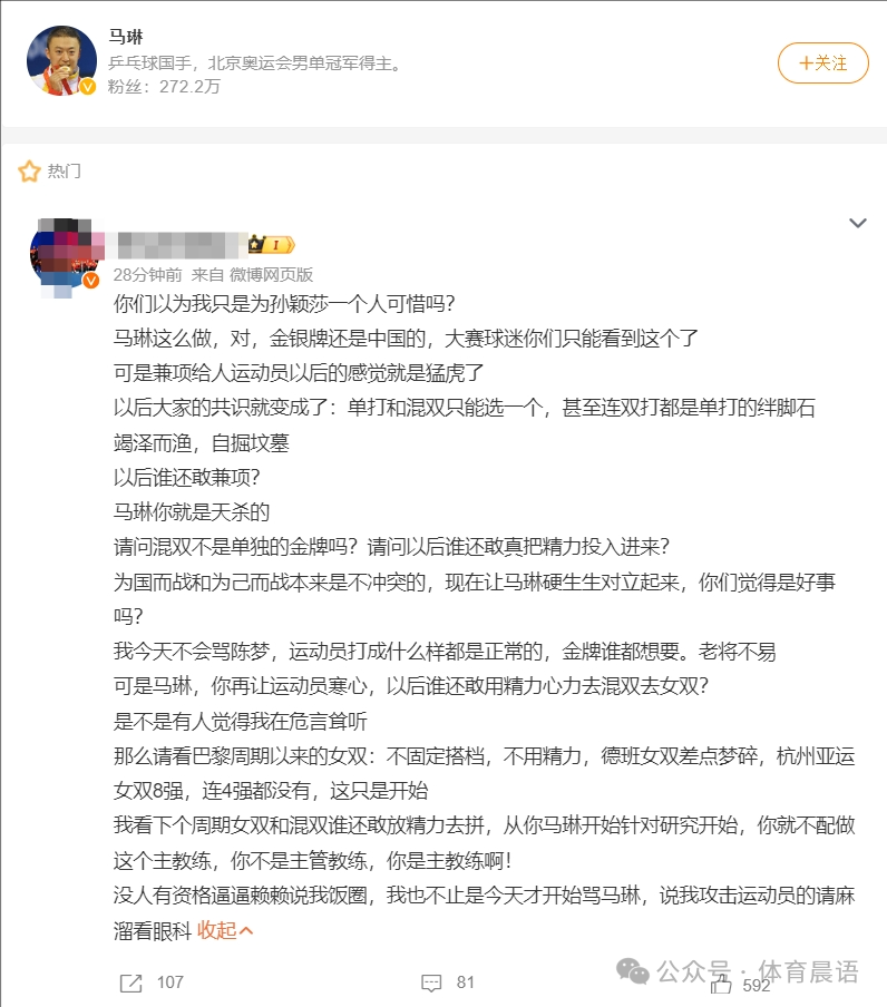只不过,陈梦的夺冠,并没有如其他中国选手在巴黎奥运会上夺冠一样,几乎是一连倒的祝福声。相反,因为陈梦的夺冠,不少人都有意见。看看网上的评论和一些博主发出来的动态,就能明白。不过,除了陈梦,还有女乒的主教练马琳同样也是焦点。这不,马琳就被一位博主在社交平台上点名怒骂。