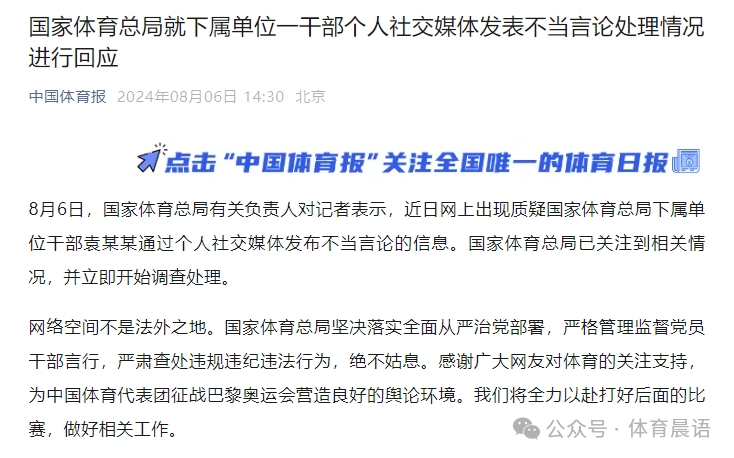 据《中国体育报》报道,国家体育总局有关负责人对记者表示,近日网上出现质疑国家体育总局下属单位干部袁某某通过个人社交媒体发布不当言论的信息。国家体育总局已关注到相关情况,并立即开始调查处理。网络空间不是法外之地。国家体育总局坚决落实全面从严治党部署,严格管理监督党员干部言行,严肃查处违规违纪违法行为,绝不姑息。感谢广大网友对体育的关注支持,为中国体育代表团征战巴黎奥运会营造良好的舆论环境。我们将全力以赴打好后面的比赛,做好相关工作。