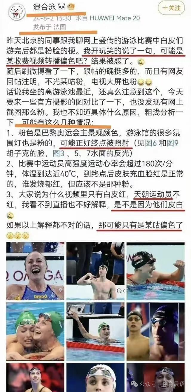 当美国游泳变脸的事成为热搜话题后,网上一位名叫“混合泳“的网友,却在这个时候发出长文,对美国游泳变脸一事进行解释。他表示自己根本就没有看到美国游泳选手这种情况,并且自己还是在现场,离游泳池最近。接着说出三点原因,一是可能正好终点被照射,出现反光,导致脸色异常。二是高强度的运动后皮肤会充血脸红。三是可能因为他们皮肤白,所以反差大。在这里,他对于中国运动员的称呼还用了一个调侃的说法。最后,他得出结论,如果解释都不对的话,那就可能只是转播平台偏色了。
