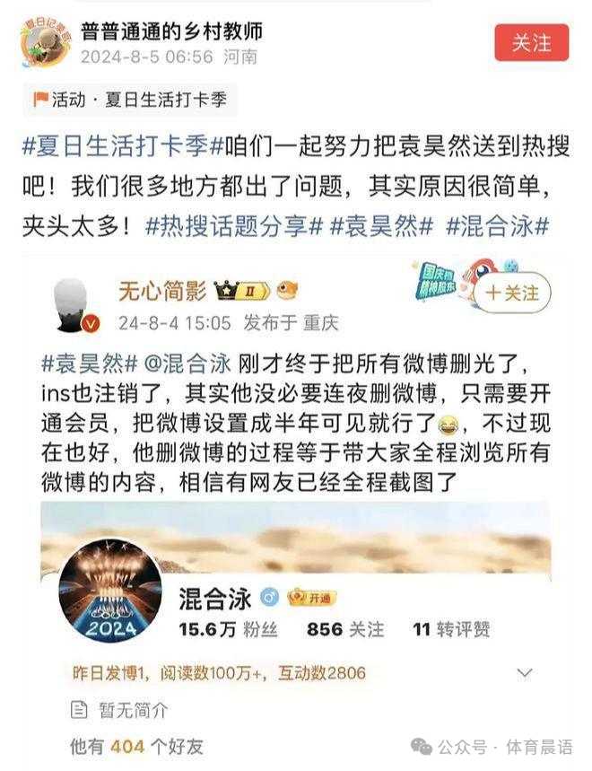 正是他的这条为美国游泳站台洗地的长文,让网友们注意到他的存在。通过他自己说的在游泳现场,并且还是离游泳池最近的描述,很明显这位“混合泳“就是中国奥运代表团的成员之下。而神通广大的网友,又通过他这么多年发布的几千多动态中分析,最后得出结论。这位”混合泳“大概率是游泳运动管理中心原游泳部主任,现自行车击剑运动管理中心副主任袁昊然。