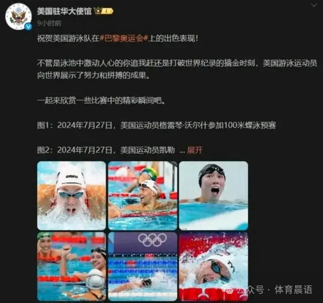 目前,巴黎奥运会游泳项目的所有比赛都已经结束了。作为世界游泳大国,不得不说,美国游泳队单纯就成绩这一块来说,确实是创造了不错的成绩。拿走了差不多游泳项目四分之一的金牌,获得了8块金牌13块银牌和7块铜牌。不过,美国游泳队虽然成绩不错,但并不让人心服口服。因为,这一届的美国游泳队,被大家调侃为“紫薯队“,几乎人人都会变脸术。如今,这一点似乎连美国自己都心虚了。看看美国大使馆发布的祝贺美国游泳队创造佳绩时报道的配图就能明白。有网友对此表示:实际上他们自己也心虚得很。