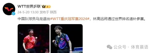 而在沙特大满贯赛事之后,国乒主力参加的一项赛事便是WTT重庆冠军赛。这一站的比赛,原定是王楚钦、樊振东、马龙和梁靖崑这几名参加巴黎奥运会的主力选手都会参赛。但在这个时候,WTT却突然官方宣布,马龙退赛:“中国队球员马龙退出WTT重庆冠军赛2024,林高远将通过世界排名递补参赛。”