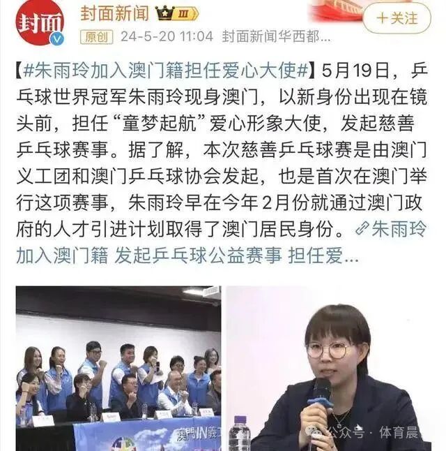 今年是奥运年,距离巴黎奥运会只有短短一两个月时间了。作为世界乒坛的霸主,国乒在巴黎奥运会上的目标自然是包揽所有的乒乓球比赛项目金牌。如今,国乒已经公布了参加巴黎奥运会的各单项参赛名单。而在这里面,陈梦与王曼昱之间的奥运女单之争一度成为热搜话题。毕竟,谁不希望能够在奥运会这样的大舞台上展示自己的风采呢。未能实现奥运女单梦想,王曼昱是有遗憾的。实际上,由于国乒内部的竞争太过于激烈,所以和王曼昱一样有遗憾的优秀球员真不少。国乒前世界第一,曾一度被队内视为“乒坛一姐”接班人的朱雨玲,也留下了这样的遗憾。如今,这位29岁的前国乒世界冠军,早已身家过亿,而在近日又传来了她的新消息,朱雨玲已正式成为了中国澳门居民。