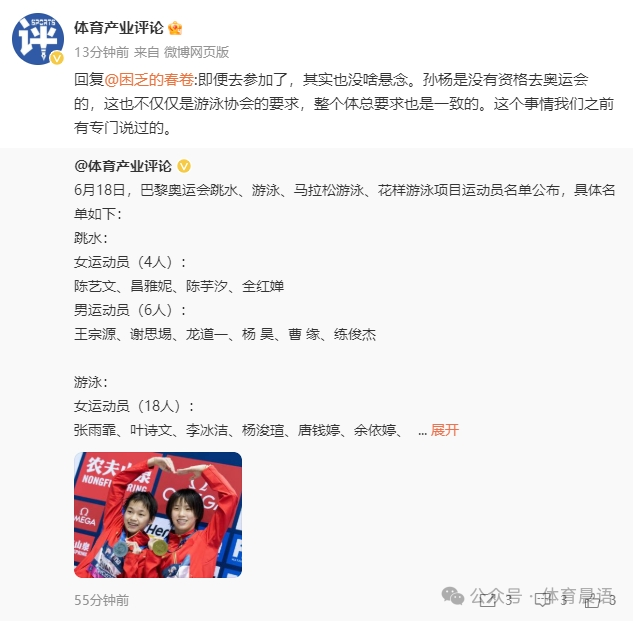 在名单公布后,知名博主“体育产业评论”在回复网友评论时进行了解释:即便去参加了,其实也没啥悬念。孙杨是没有资格去奥运会的,这也不仅仅是游泳协会的要求,整个体总要求也是一致的。